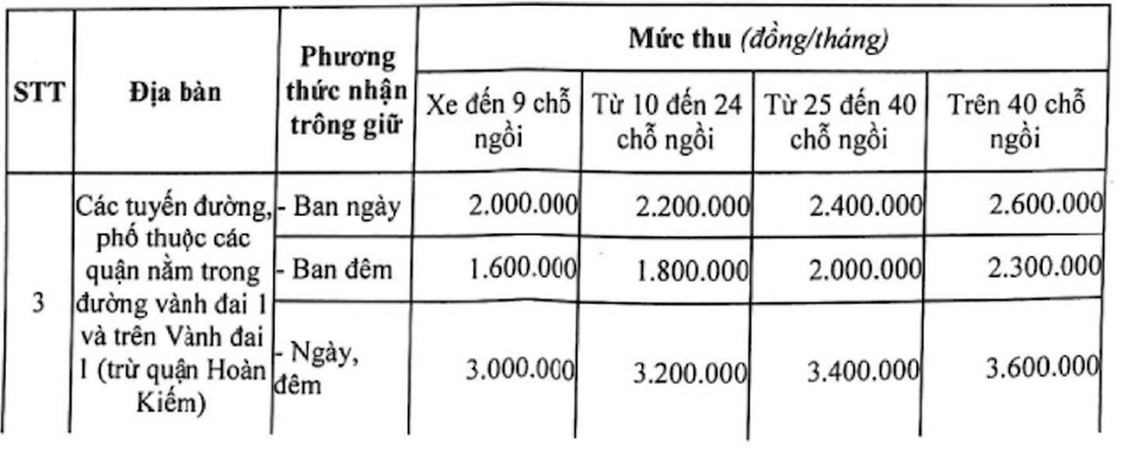 - Mức giá dịch vụ trông giữ xe ô tô đến 09 chỗ ngồi theo tháng tại các tòa nhà chung cư, trung tâm thương mại, giàn trông giữ xe hiện đại được đầu tư bằng nguồn vốn ngân sách Nhà nước (trang bị hệ thống giám sát, trông giữ xe thông minh: Camera theo dõi, kiểm tra phương tiện người gửi; quản lý điểm đỗ; ra vào quẹt thẻ theo dõi giờ vào, giờ ra và tính tiền, in hóa đơn tự động, bảo hiểm gửi xe): Bằng mức giá dịch vụ trông giữ xe ô tô đến 09 chỗ ngồi theo các tuyến đường, phố thuộc các quận nằm trong đường vành đai 1 và trên vành đai 1 (số thứ tự 3 tại bảng trên);