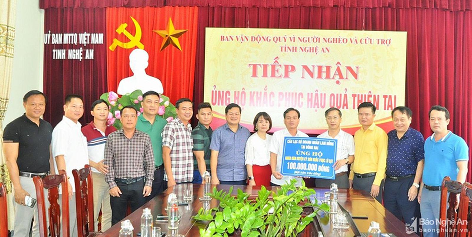 CLB Doanh nhân Lam Hồng tại Đồng Nai trao tiền hỗ trợ nhân dân huyện Kỳ Sơn (Nghệ An) khắc phục hậu quả thiên tai. Ảnh: Báo Nghệ An