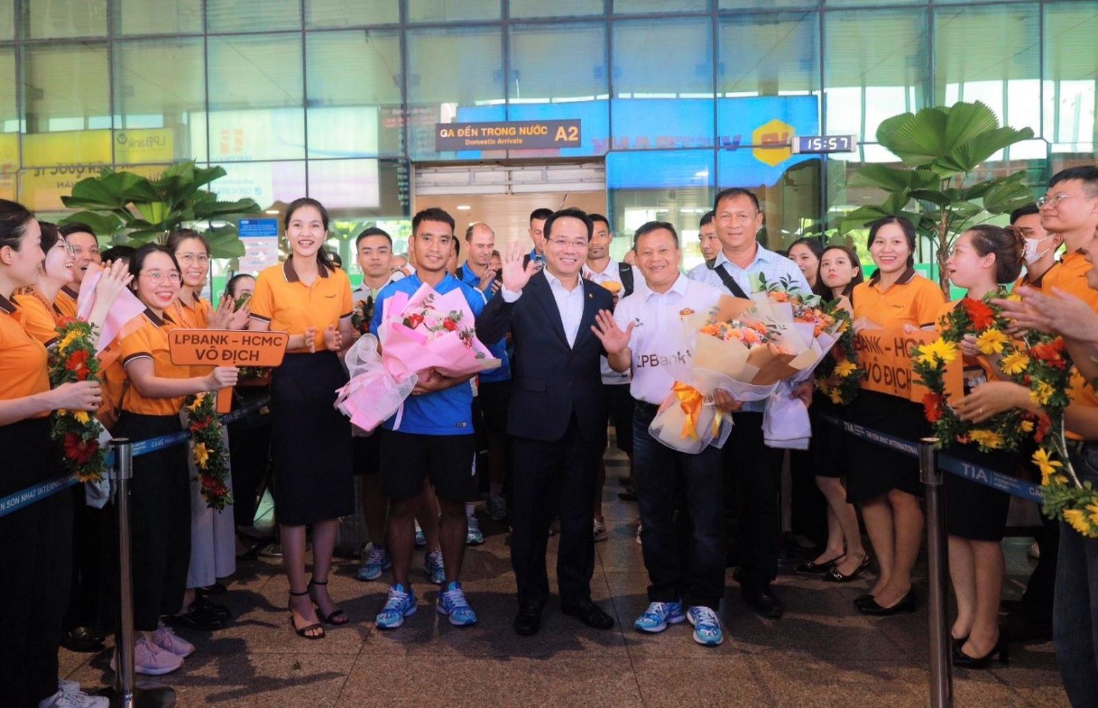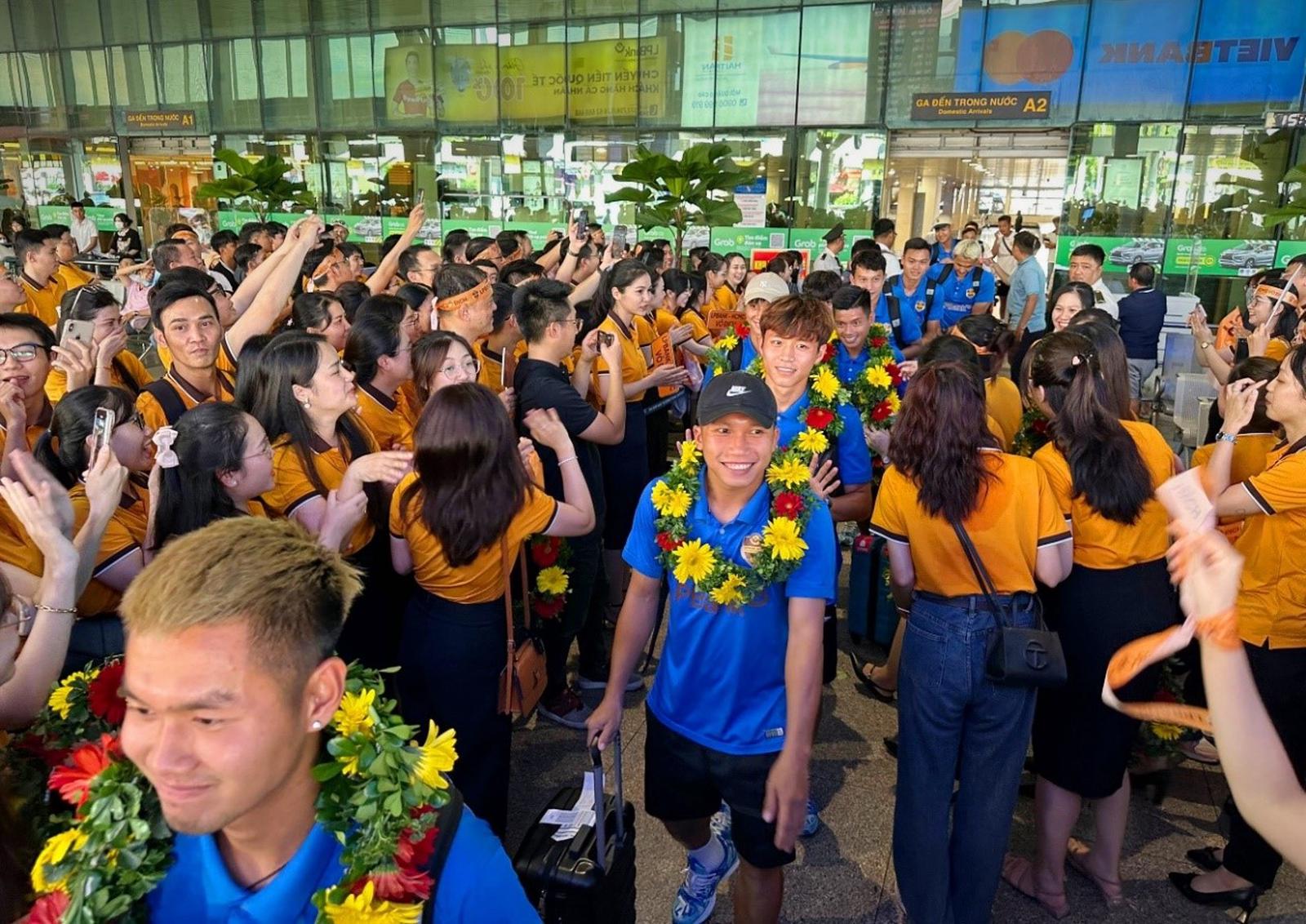 Thầy trò HLV Lư Đình Tuấn nhận được sự chào đón nhiệt thành của các cổ động viên. Khoảnh khắc đoàn bước ra sân bay hàng trăm cổ động viên liên tục hò reo, gửi lời chúc mừng đến các cầu thủ và ban huấn luyện. Đại diệnTrung tâm Thể dục Thể thao Thống Nhất và nhà tài trợ LPBank đã có mặt để chào đón, trao hoa và quà để động viên thành tích của cả đội.