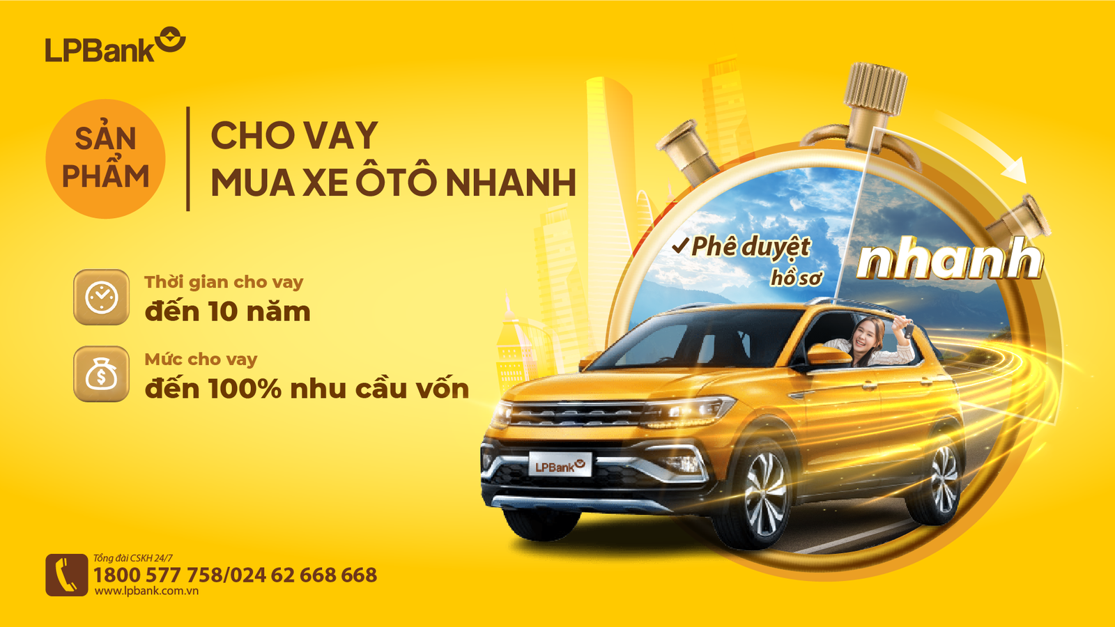 Với mong muốn chung tay cùng Chính phủ kích cầu tiêu dùng, đồng hành cùng khách hàng hiện thực hóa giấc mơ sở hữu chiếc ô tô cho riêng mình, từ ngày 12/03/2024, LPBank ra mắt sản phẩm cho vay mua xe ô tô nhanh. Đây là một trong chuỗi các sản phẩm cho vay của LPBank được thiết kế may đo theo hướng đơn giản hồ sơ, nhanh gọn thủ tục cho khách hàng. Theo đó, chỉ trong vài tiếng là khách hàng có thể được giải ngân vay mua xe mà không phải chờ đợi lâu. LPBank cũng là một trong những ngân hàng đi đầu trong việc triển khai các gói cho vay đối với khách hàng cá nhân với lãi suất ưu đãi hấp dẫn chỉ từ 6,5%/năm. Khách hàng có thể tự tin lựa chọn mẫu xe ưa thích mà không phải lo lắng về vấn đề tài chính.