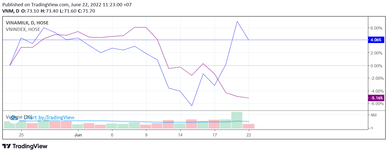 Giá cổ phiếu VNM trong tương quan với VNIndex trong 1 tháng. (VNM: Đường kẻ xanh, VNIndex: Đường kẻ tím). Nguồn: TradingView