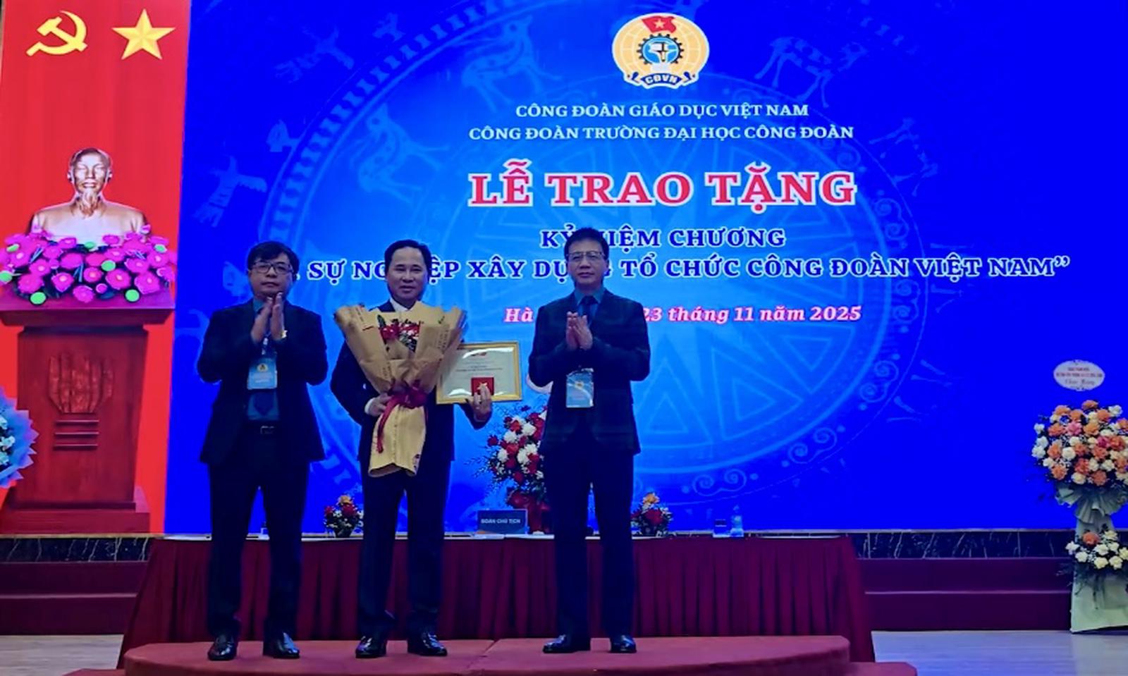 Công đoàn Trường Đại học Công đoàn đã trao Kỉ niệm chương vì sự nghiệp xậy dựng tổ chức công đoàn cho PGS.TS. Lê Mạnh Hùng, Bí thư Đảng ủy, Hiệu trưởng Nhà trường. Ảnh: TT