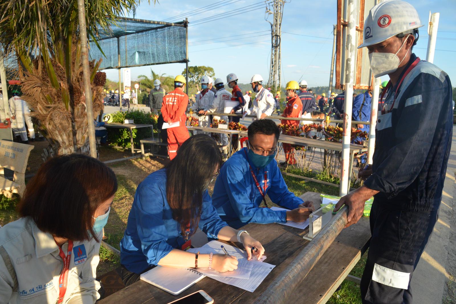 Lực lượng Đoàn thanh niên BSR hỗ trợ nhà thầu khai báo y tế trước khi vào công trường làm việc.