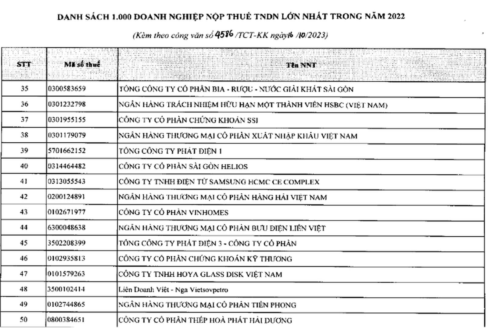 TCBS trong Top 46 doanh nghiệp nộp thuế lớn nhất Việt Nam. Nguồn: Bộ Tài chính và Tổng Cục Thuế
