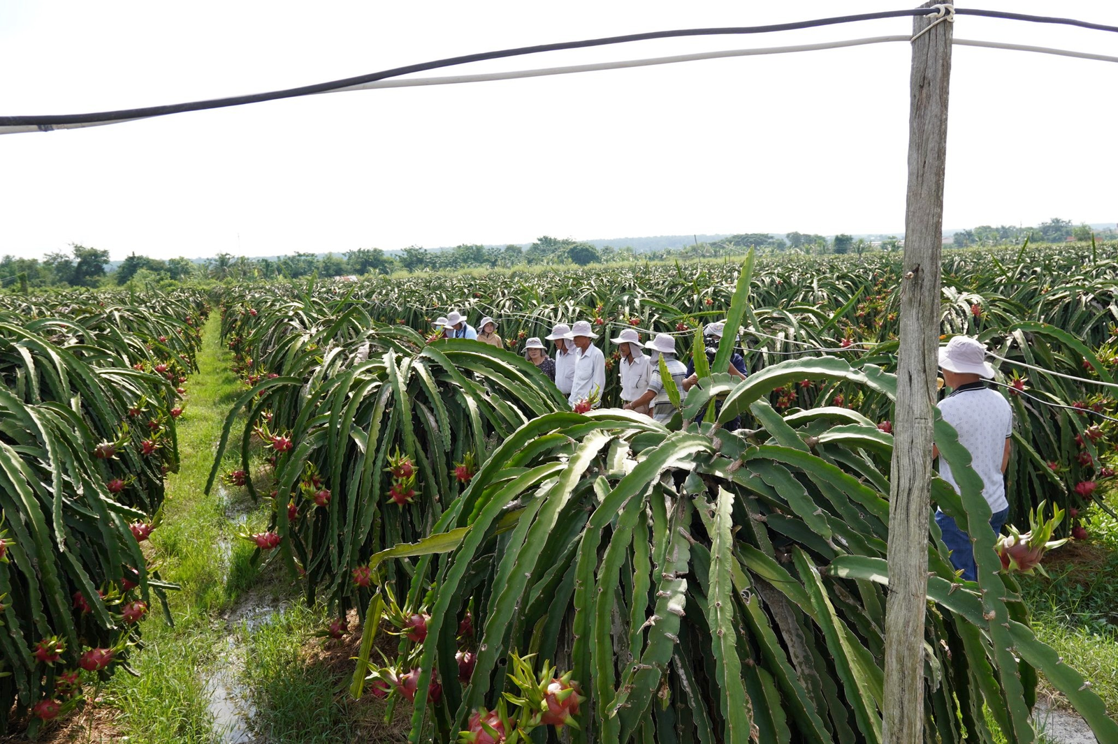 Cán bộ kỹ thuật và người dân thăm mô hình sử dụng Phân bón hữu cơ SFJC Bio-Gold G.A.P trên cây thanh long ở Bình Thuận.