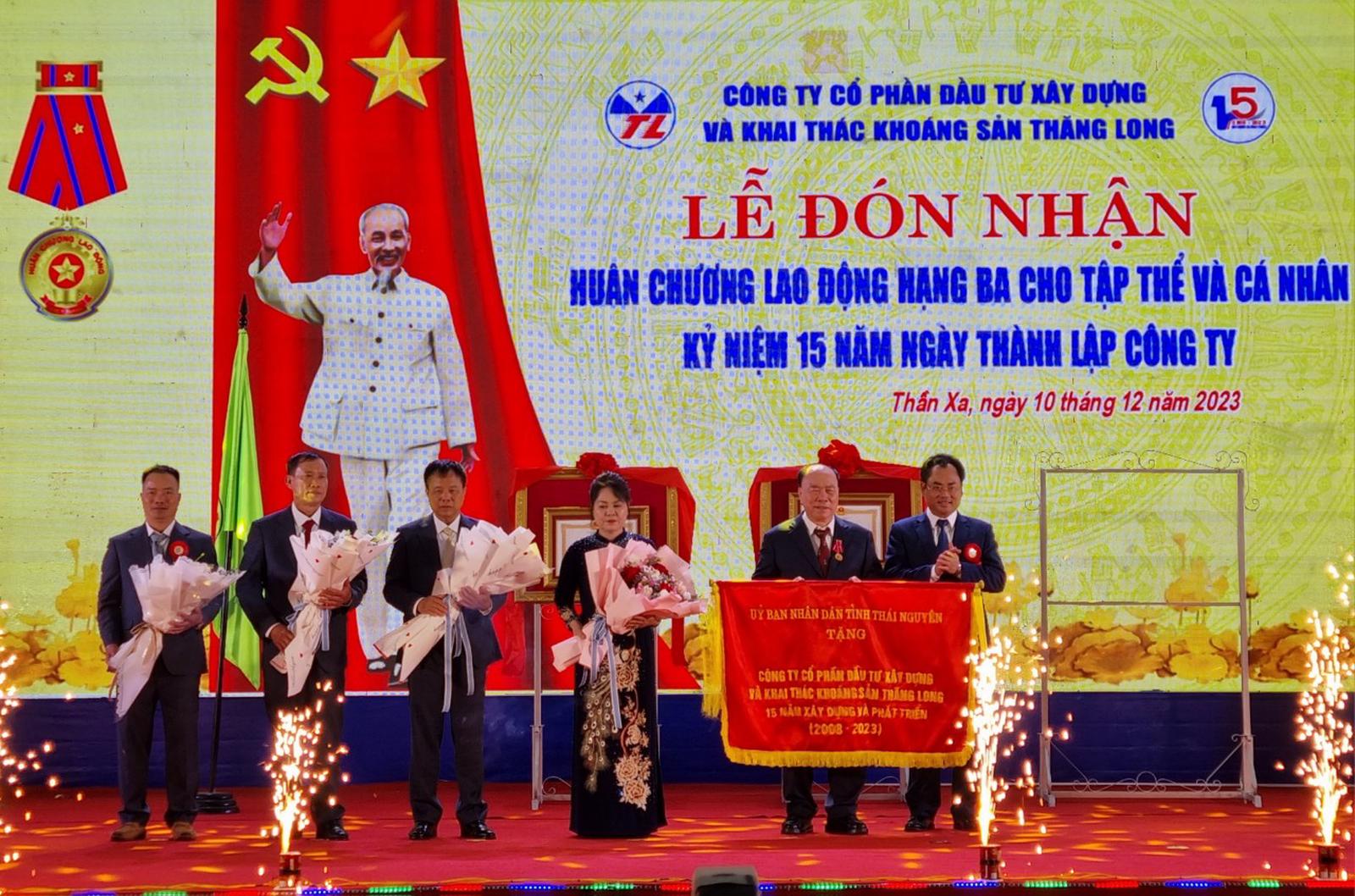 Thừa ủy quyền của Chủ tịch nước, Bí thư Tỉnh ủy Thái Nguyên Nguyễn Thanh Hải trao Huân chương Lao động hạng Ba cho ông Nguyễn Huy Quý, Chủ tịch Chủ tịch Hội đồng Quản trị, Tổng Giám đốc Công ty CP Đầu tư xây dựng và Khai thác khoáng sản Thăng Long. Ảnh: Hoàng Long