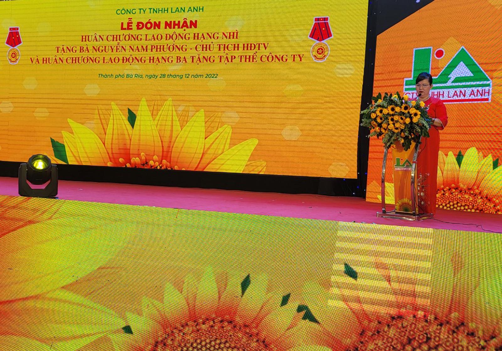 Thừa ủy quyền của Chủ tịch nước, Phó Bí thư Thường trực Tỉnh ủy Bà Rịa – Vũng Tàu Nguyễn Thị Yến trao tặng Huân chương Lao động hạng Ba cho tập thể Công ty TNHH Lan Anh