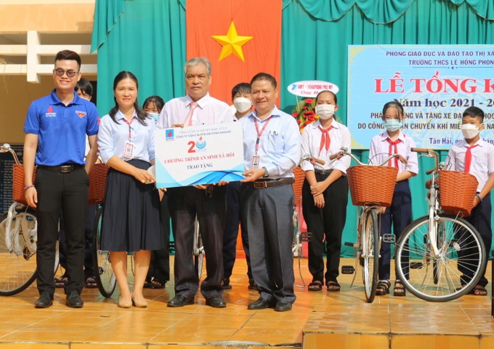 (Thanh tra)- Nhân dịp kết thúc năm học 2021 – 2022, chào mừng Ngày Quốc tế Thiếu nhi 1/6, Ban lãnh đạo, Công đoàn, Đoàn thanh niên, đại diện các Phòng/Phân xưởng vận hành của Công ty Vận chuyển khí Đông Nam Bộ (KĐN) đã phối hợp cùng với UBMTTQ Thị xã Phú Mỹ (Bà Rịa – Vũng Tàu) và Ban giám hiệu các trường trên địa bàn trao tặng 100 chiếc xe đạp cho các em học sinh hiếu học với tổng giá trị lên đến 250 triệu đồng.