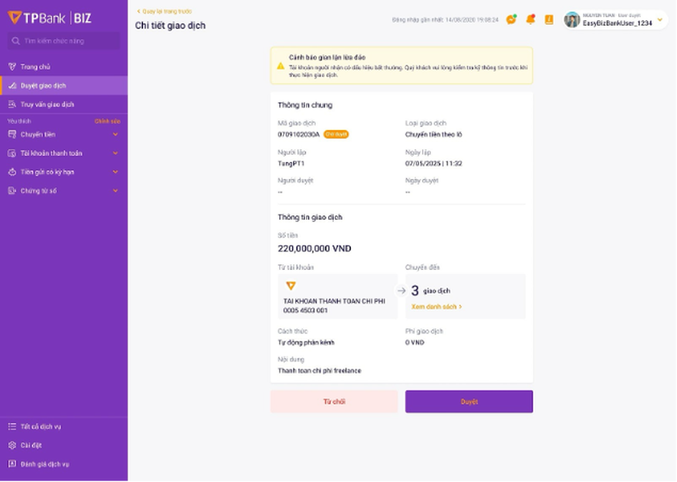 Ngược lại, nếu hệ thống xác định tài khoản người nhận có liên quan đến hành vi gian lận hoặc nằm trong danh sách đã được xác minh là rủi ro cao, TPBank sẽ chủ động từ chối xử lý giao dịch, đồng nghĩa với việc khách hàng không thể thực hiện chuyển tiền dưới bất kỳ hình thức nào.