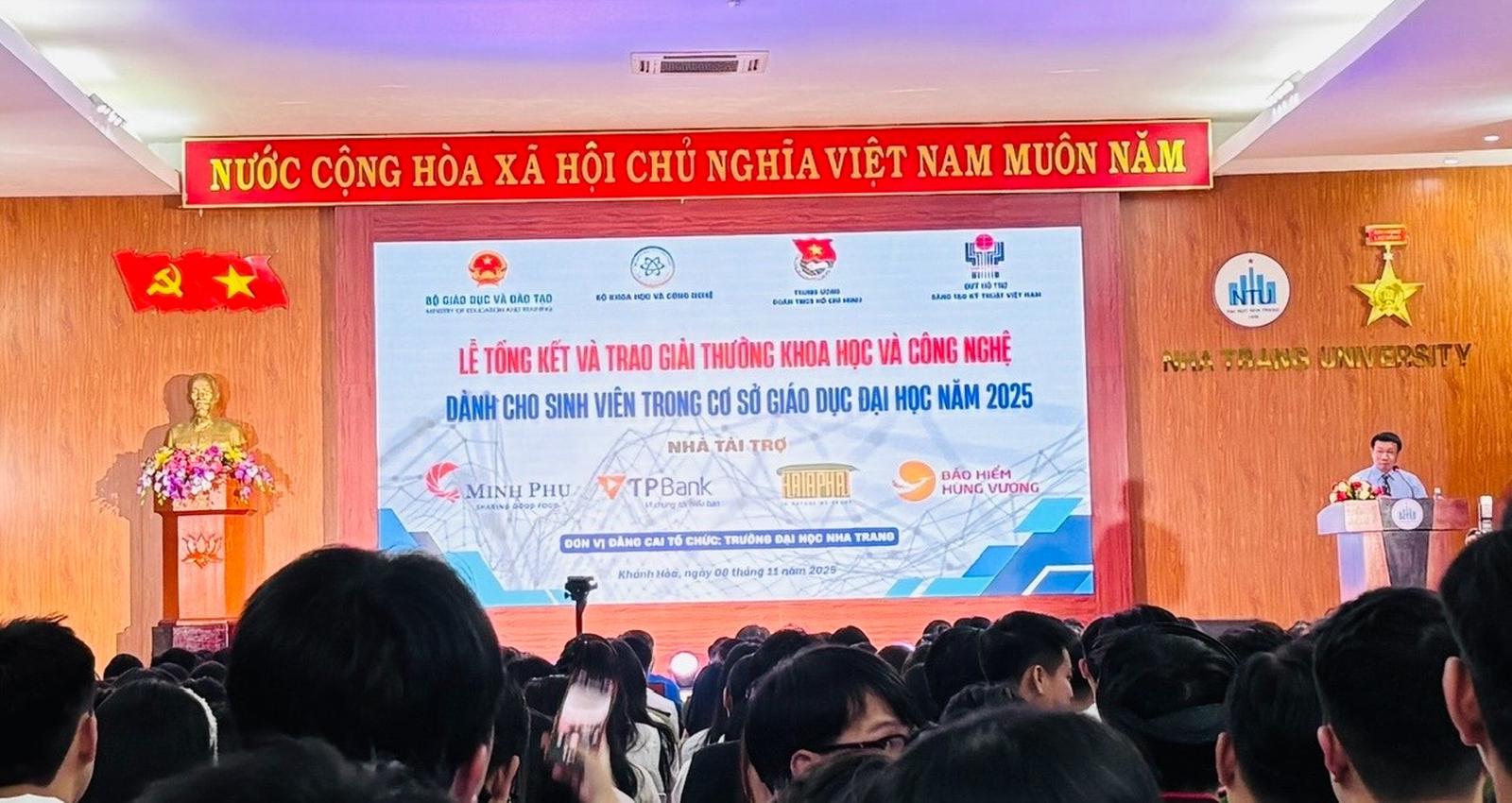 Ngày 8/11, tại Trường Đại học Nha Trang đã diễn ra Lễ tổng kết Giải thưởng Khoa học và Công nghệ dành cho sinh viên trong các cơ sở giáo dục đại học năm 2025 đã được tổ chức trang trọng với sự phối hợp của Bộ Giáo dục và Đào tạo, Bộ Khoa học và Công nghệ, Trung ương Đoàn Thanh niên Công sản Hồ Chí Minh và Quỹ hỗ trợ sáng tạo kỹ thuật Việt Nam.