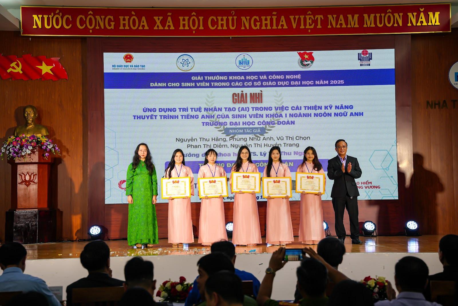 Nhóm sinh viên Khoa Ngoại ngữ của Trường Đại học Công đoàn nhận Giải Nhì tại Giải thưởng Khoa học và Công nghệ dành cho sinh viên trong các cơ sở giáo dục đại học năm 2025. Ảnh: CĐ