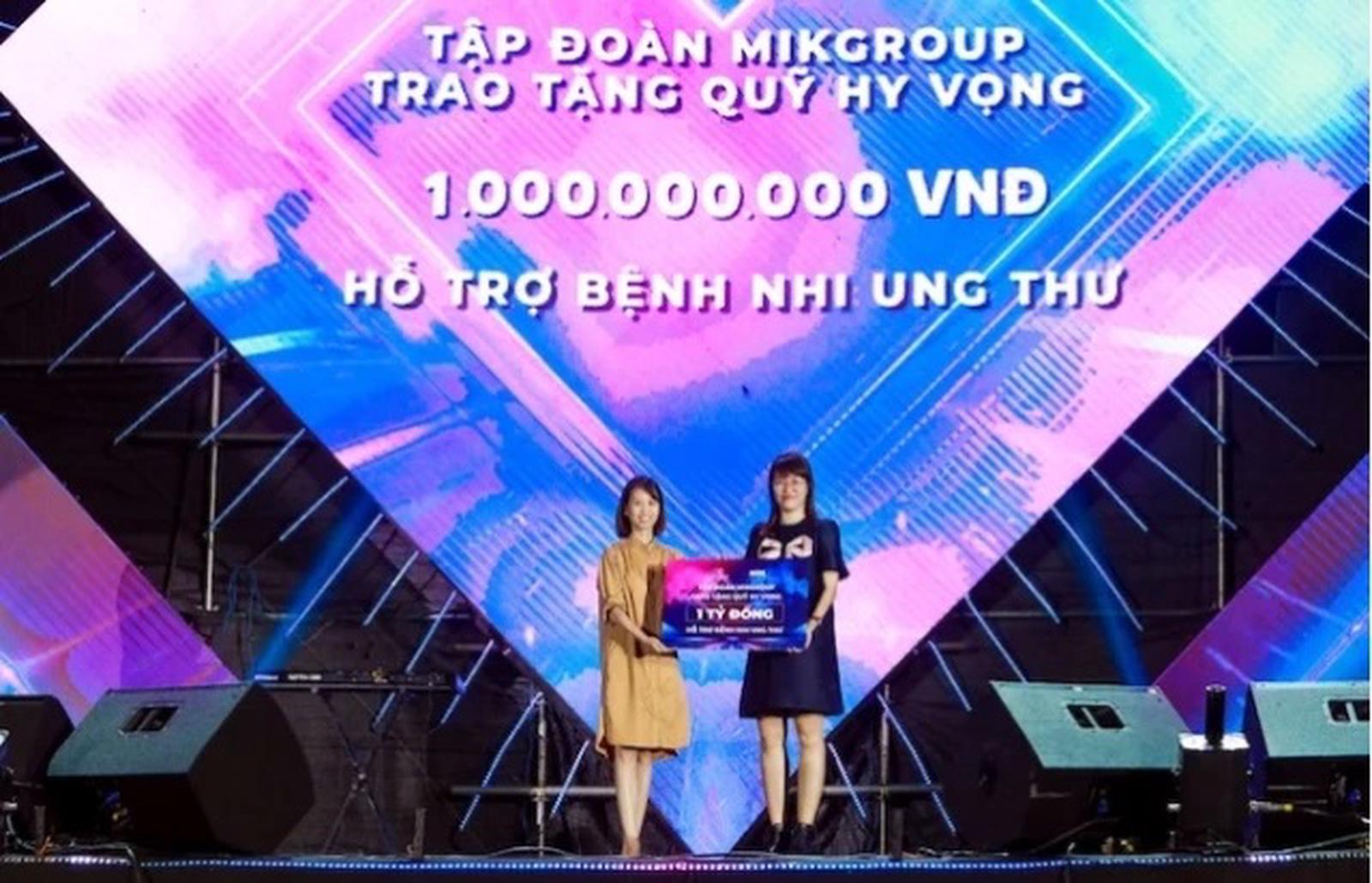 Đại diện MIKGroup (bên phải) trao tặng 1 tỷ đồng cho quỹ HOPE thực hiện chương trình hỗ trợ bệnh nhi ung thư