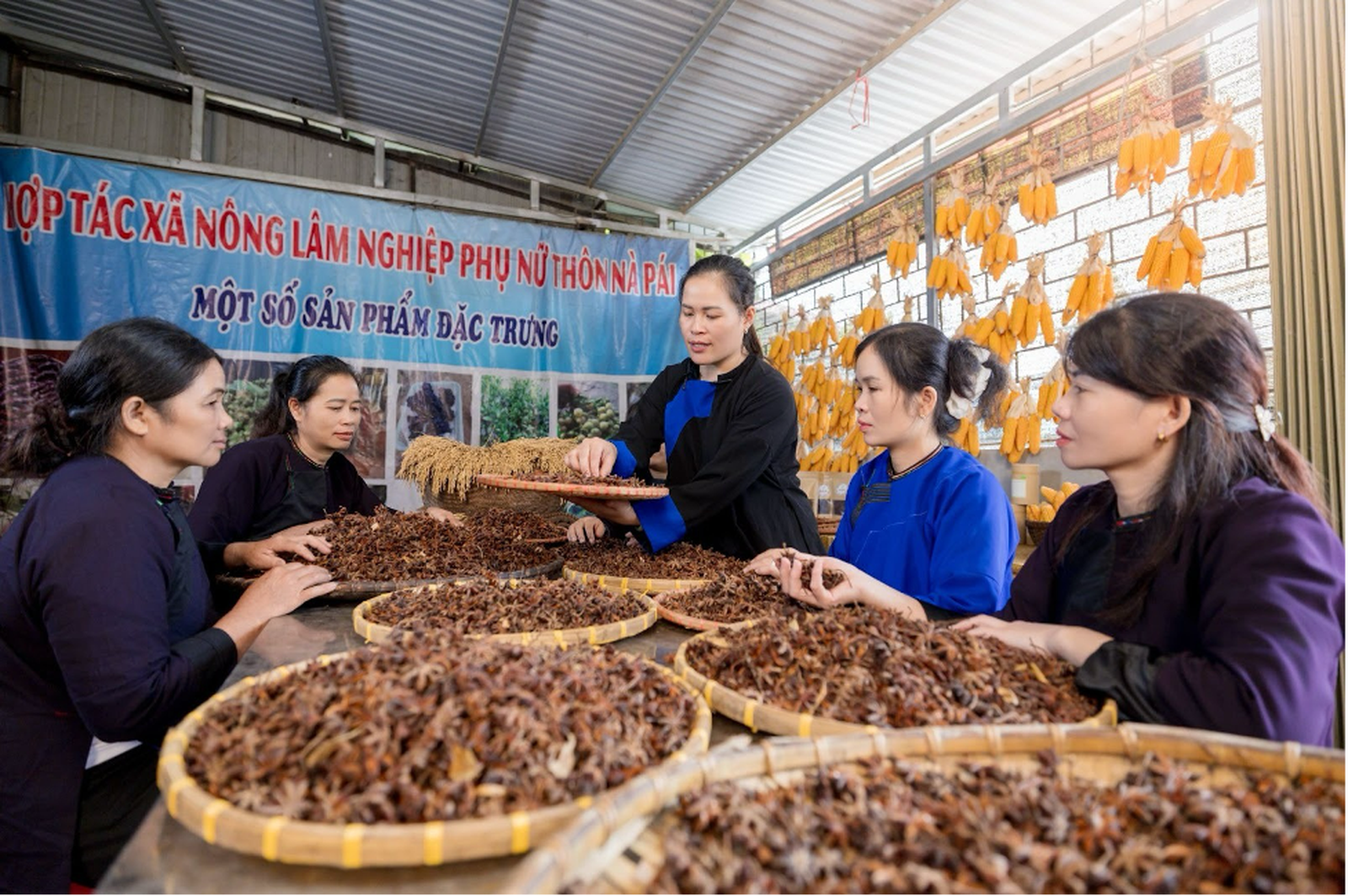 Chị Hoàng Thị Bích Ngọc (giữa) cùng các chị em phụ nữ thôn Nà Pái phát triển mô hình sản xuất nông sản địa phương.