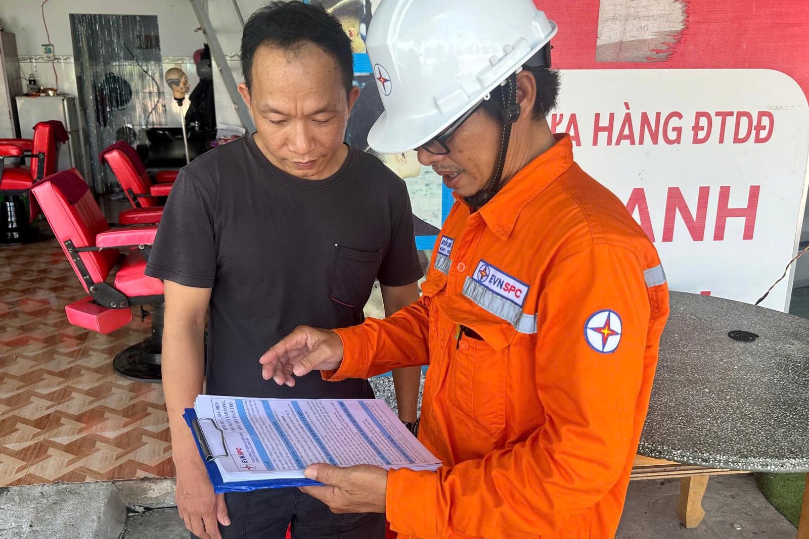 Cán bộ, công nhân viên EVNSPC hướng dẫn các chủ nhà trọ thực hiện giá bán điện theo đúng quy định. Ảnh: EVNSPC