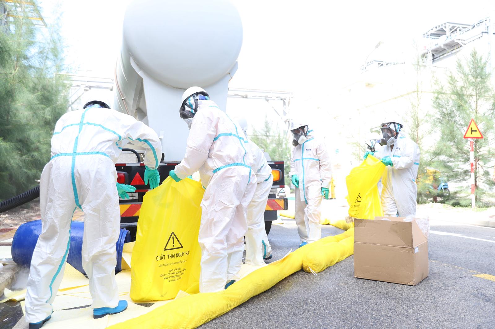 Người phát hiện (VHV trực tổ máy) lập tức truy hô thông báo, đeo mặt nạ phòng độc, tiếp cận và đưa người bị thương ra khỏi khu vực xảy ra sự cố, nhanh chóng sử dụng bộ đàm báo cho Trưởng ca báo cáo Ban chỉ huy ƯPSCTD, ƯPSCHC điều động các nguồn lực ứng phó của Nhà máy: Đội PCCC cơ sở, đội y tế, đội ƯPSCTD, đội ƯPSCHC, đội bảo vệ... các lực lượng đã nhanh chóng có mặt phối hợp, huy động trang thiết bị cấp cứu người bị nạn, dập tắt đám cháy, điều động vật tư chuyên dụng tiến vào hiện trường, sử dụng băng rào cảnh báo để tạo vùng cách ly khu vực sự cố, dùng phao quây thấm dầu và phao quây chuyên dụng để cô lập nhớt đổ, thu hồi nhớt đổ bằng vật tư thấm hút chuyên dụng.