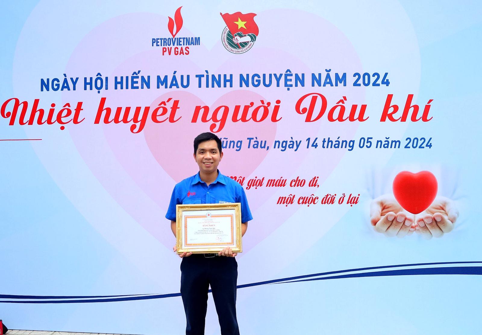 Cũng tại sự kiện, đại diện Hội chữ thập đỏ tỉnh Bà Rịa – Vũng Tàu đã trao bằng khen ghi nhận đóng góp của anh Hoàng Ngọc Quý - Ủy viên BCH Đoàn cơ sở - Bí thư Đoàn thanh niên Chi đoàn Khối Văn phòng PV GAS VUNG TAU với thành tích xuất sắc trong công tác tuyên truyền vận động hơn 200 lượt người tham gia Hiến máu tình nguyện từ năm 2019-2023.