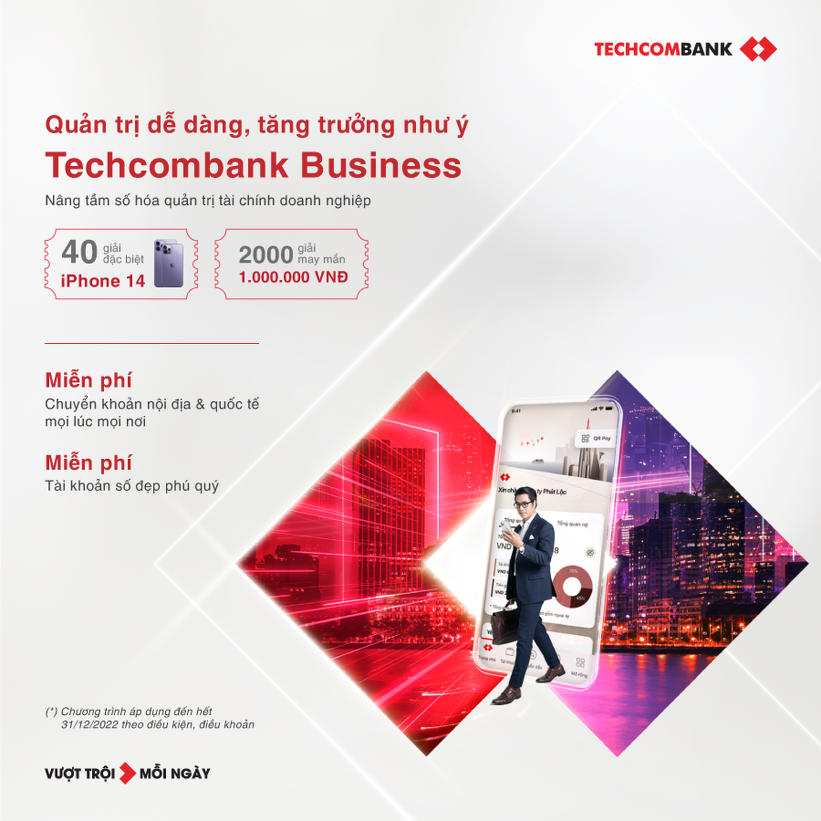 Với mong muốn nâng tầm số hóa quản trị tài chính cho doanh nghiệp bứt phá thành công cuối năm 2022, Techcombank đem đến chương trình ưu đãi “Quản trị dễ dàng – Tăng trưởng như ý” cùng hàng ngàn giải thưởng hấp dẫn với tổng trị giá lên tới hơn 3 tỷ đồng đang chờ đón doanh nghiệp mở tài khoản và giao dịch cùng Ngân hàng số Techcombank Business: