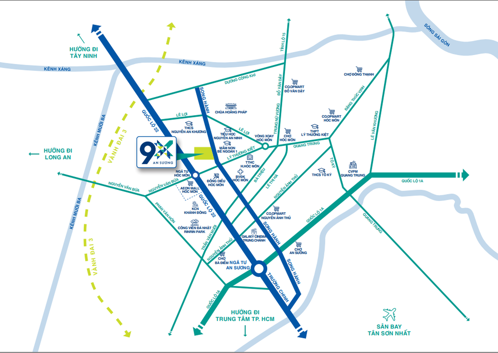 Là dự án thứ 2 trong chuỗi căn hộ 9X dành cho người trẻ, 9X An Sương sở hữu vị trí đắc địa tại khu vực trung tâm Hóc Môn, trên mặt tiền đường Song Hành thông thoáng, liền kề nhiều tuyến giao thông huyết mạch như đường Lê Lợi, Lý Thường Kiệt, trục đường Trường Chinh, Quốc lộ 22, Quốc lộ 1A… Nhờ đó, cư dân dự án có thể dễ dàng di chuyển đến khu vực trung tâm thành phố, Sân bay Tân Sơn Nhất hay các tỉnh lân cận như Bình Dương, Long An, Tây Ninh…