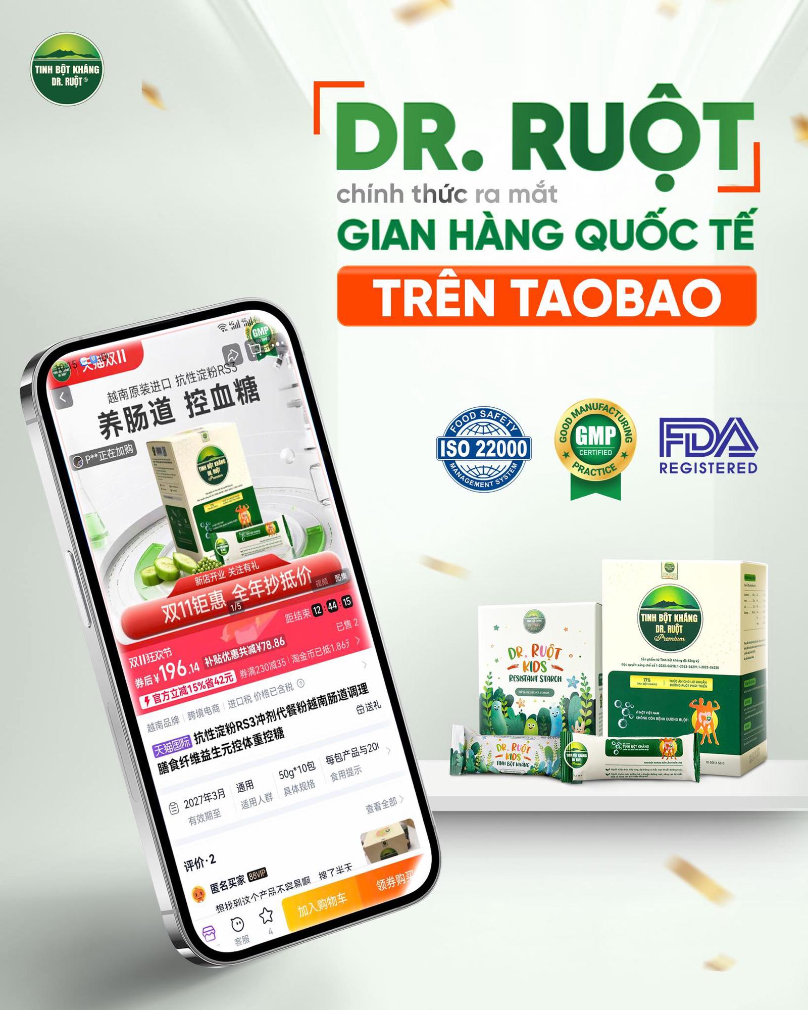 Không chỉ khẳng định vị thế tại thị trường nội địa, DR. RUỘT đang từng bước hiện thực hóa mục tiêu đưa thương hiệu Việt ra thế giới. Thông qua sàn thương mại điện tử Taobao, sản phẩm Tinh Bột Kháng của công ty đã bắt đầu tiếp cận người dùng tại Trung Quốc, Hồng Kông và Macau.
