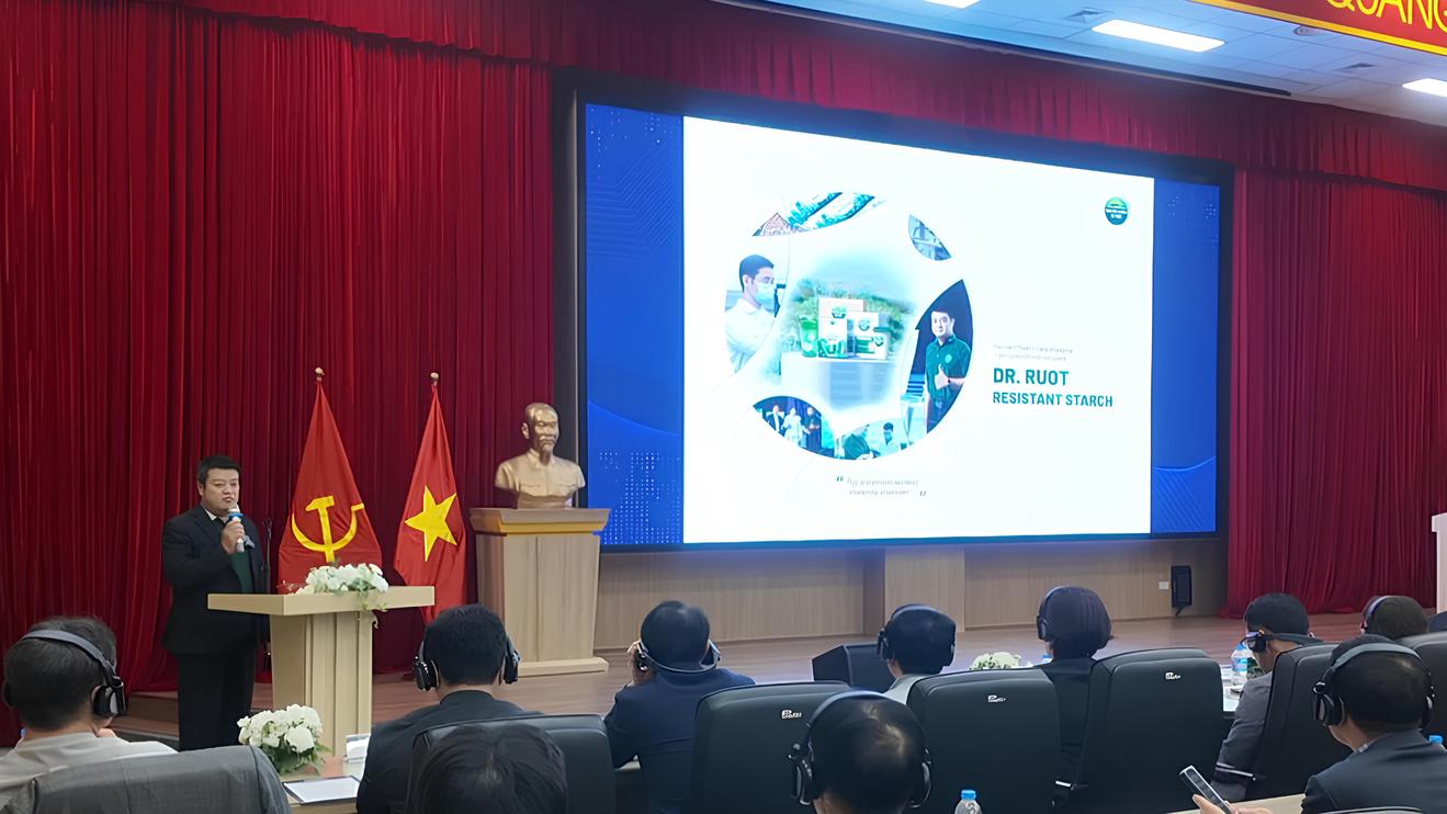 Ông Nguyễn Tuấn Dương - Tổng Giám đốc Công ty Cổ phần Chăm sóc sức khỏe đường ruột Việt Nam báo cáo kết quả đề tài hợp tác ứng dụng tinh bột kháng giữa Dr. Ruột và Viện Việt Nam Hàn Quốc