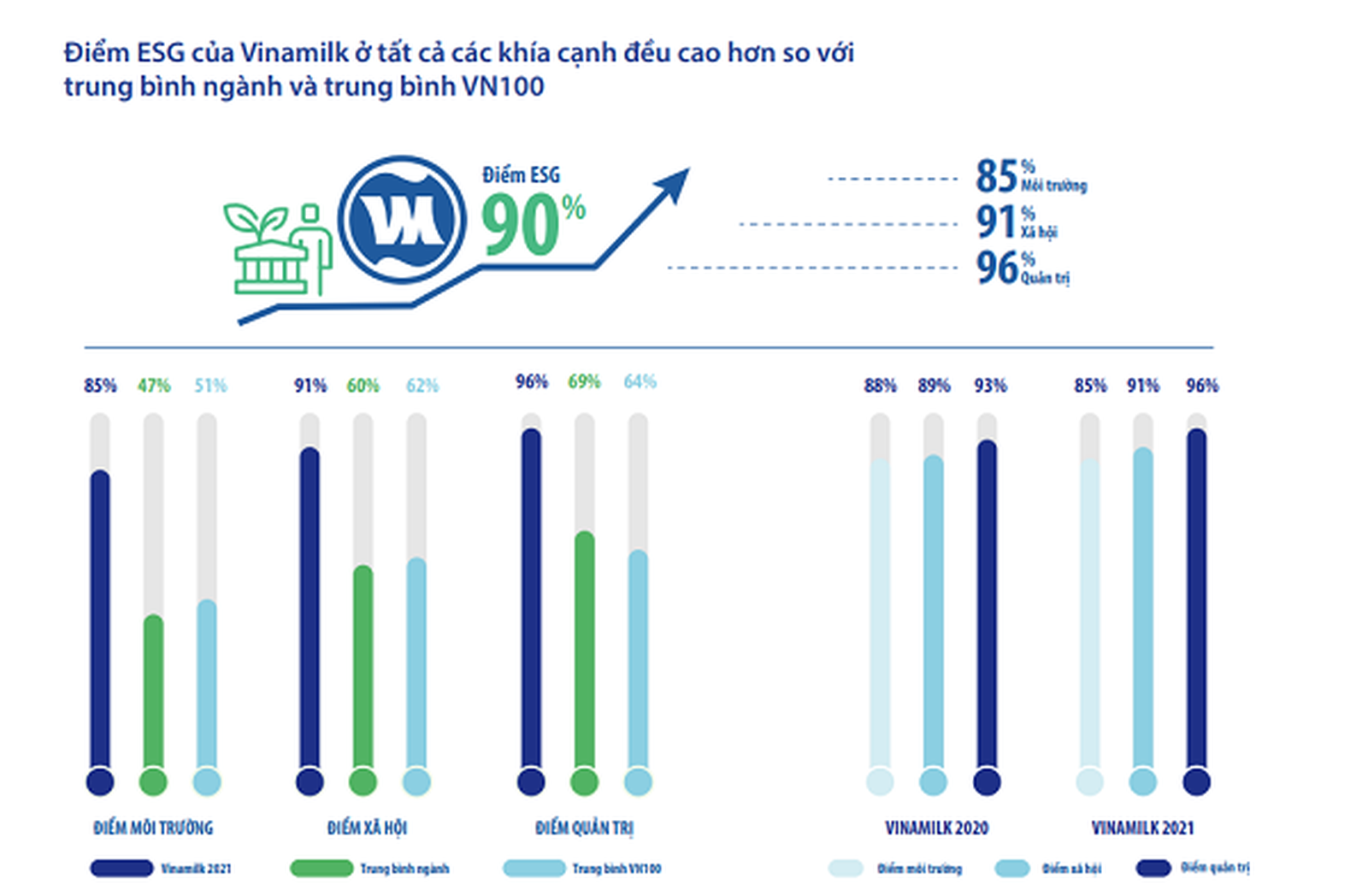 Năm 2021, Vinamilk tiếp tục giữ vững vị trí trong top 20 cổ phiếu xanh VNSI (liên tục tính từ năm 2017), với tổng điểm ESG đánh giá đạt 90%