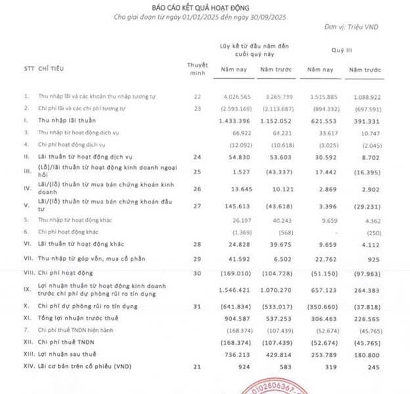 Về nguồn vốn, nợ phải trả tại 30/09/2025 đạt 61.917 tỷ đồng, tăng 11.326 tỷ đồng (tương đương tăng 22,4%) so với đầu năm 2025. Trong đó, đáng chú ý và các khoản mục tăng mạnh như phát hành giấy tờ có giá tăng từ 18.556 lên 28.047 tỷ đồng, tương đương tăng 51%; Tiền gửi và vay các TCTD khác tăng từ 11.734 lên 13.959 tỷ đồng. Vốn chủ sở hữu tại ngày 30/09/2025 đạt