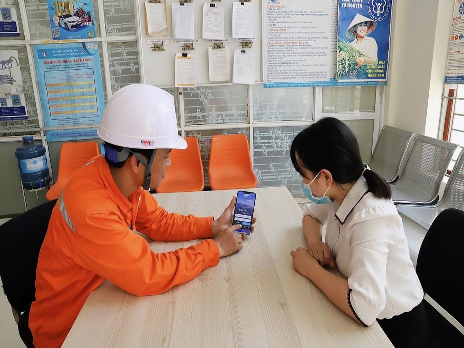 Nhân viên điện lực hướng dẫn khách hàng thanh toán tiền điện qua điện thoại thông minh.Ảnh: Kim Ngân