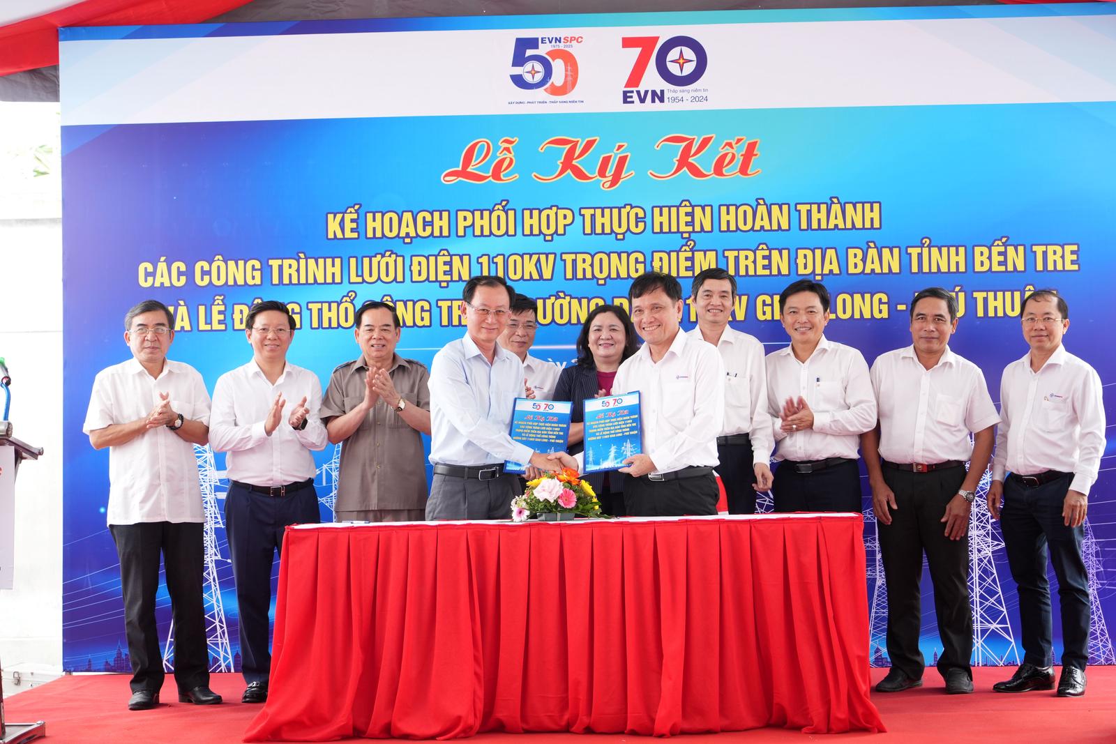 Tại buổi lễ, EVNSPC và UBND tỉnh Bến Tre đã ký giao ước thi đua thực hiện hoàn thành các công trình lưới điện 110kV trên địa bàn tỉnh Bến Tre; tổ chức động thổ công trình đường dây 110kV Giao Long - Phú Thuận. Đây là một trong những hoạt động thiết thực lập thành tích chào mừng Đại hội đại biểu Đảng bộ tỉnh lần thứ XII, nhiệm kỳ 2025-2030; chào mừng 50 năm thành lập EVNSPC và 70 năm ngày truyền thống ngành Điện lực Việt Nam; hiện thực hóa cam kết thỏa thuận giữa EVNSPC và lãnh đạo tỉnh Bến Tre về hoàn thiện lưới điện 110kV, đáp ứng cấp điện phục vụ sản xuất và thu hút đầu tư của tỉnh.