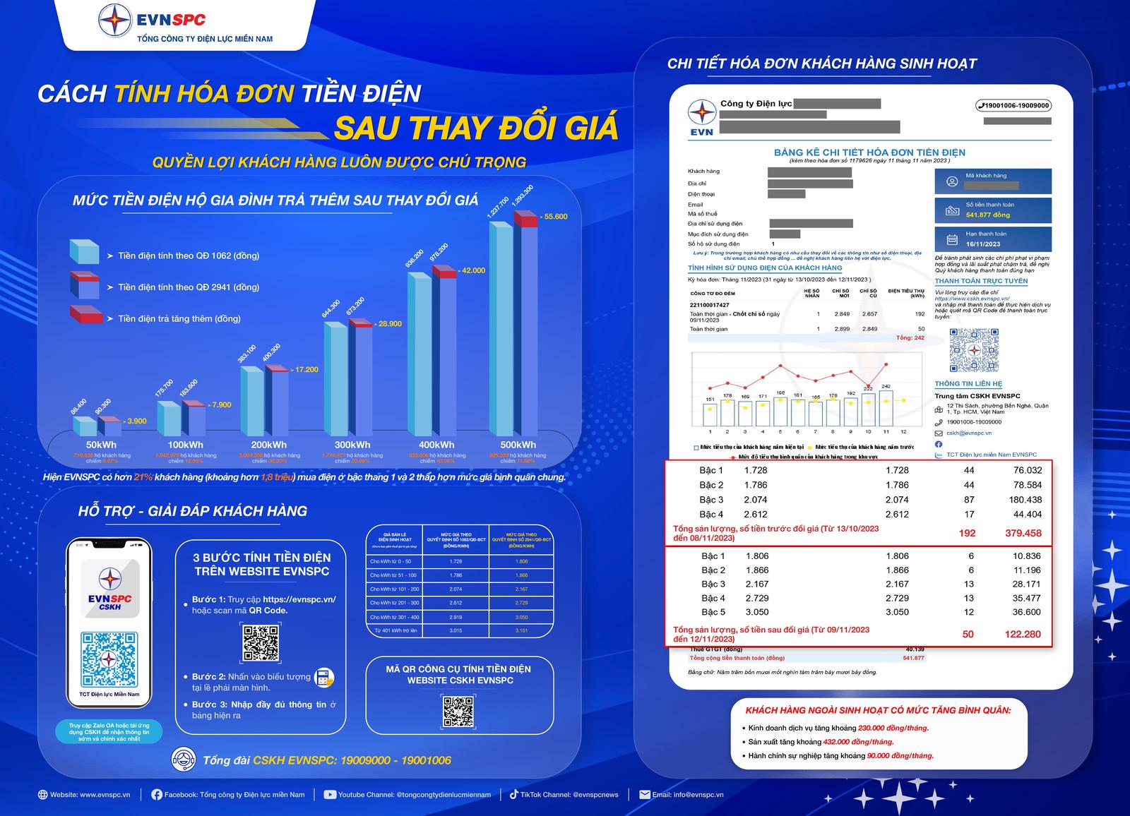 Về mức tăng trung bình đối với nhóm khách hàng khác cũng có những thay đổi khác nhau. Cụ thể, với nhóm khách hàng ngoài sinh hoạt, mức tăng trung bình như sau: nhóm khách hàng kinh doanh dịch vụ, khách hàng trả thêm khoảng 230.000 đồng/tháng; nhóm sản xuất, sau khi thay đổi giá, khách hàng sẽ trả thêm khoảng 432.000 đồng/tháng. Hiện nay, tổng số khách hàng EVNSPC cung cấp điện là 9.307.078 khách hàng. Trong đó có 8.355.116 khách hàng sử dụng điện cho mục đích quản lý - tiêu dùng - dân cư; 487.383 khách hàng sử dụng điện mục đích nông nghiệp - lâm nghiệp - thủy sản; 144.695 khách hàng sử dụng cho công nghiệp và xây dựng; 154.661 khách hàng sử dụng điện mục đích kinh doanh và dịch vụ; 165.223 khách hàng sử dụng với mục đích khác.