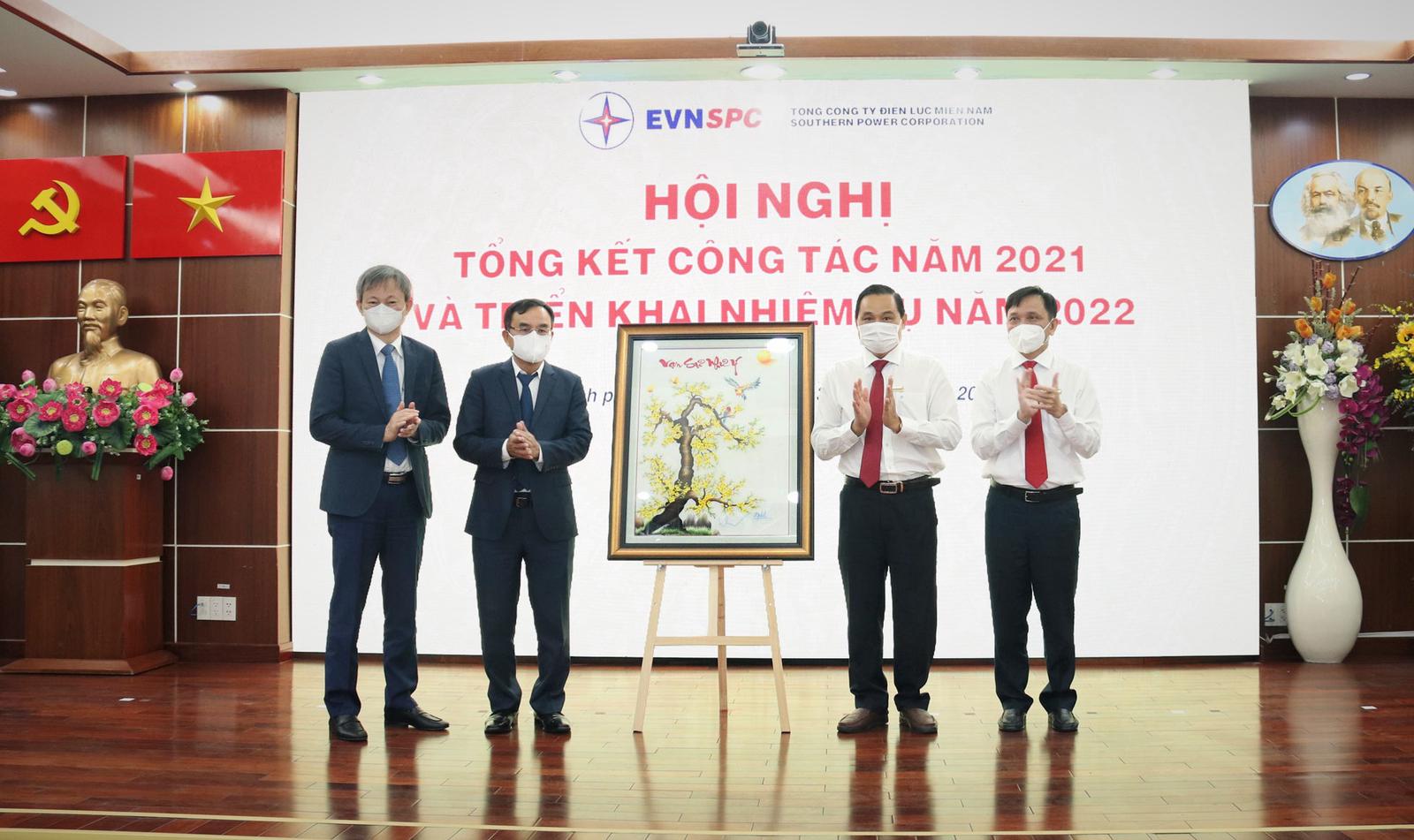 Lãnh đạo EVN trao tặng bức tranh ghi nhận đóng góp của EVNSPC vào thành tích chung của Tập đoàn Điện lực Việt Nam