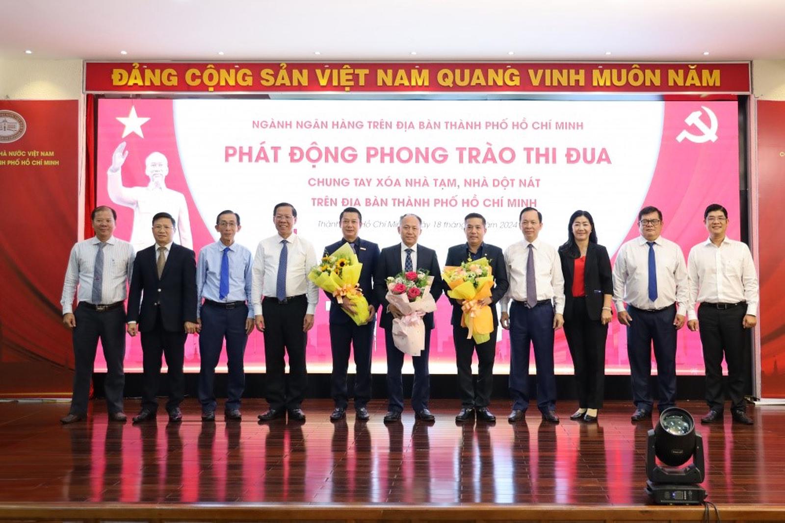 Đại diện các ngân hàng cùng đại diện UBND TP HCM và Uỷ ban MTTQ Việt Nam TP HCM chụp hình lưu niệm.
