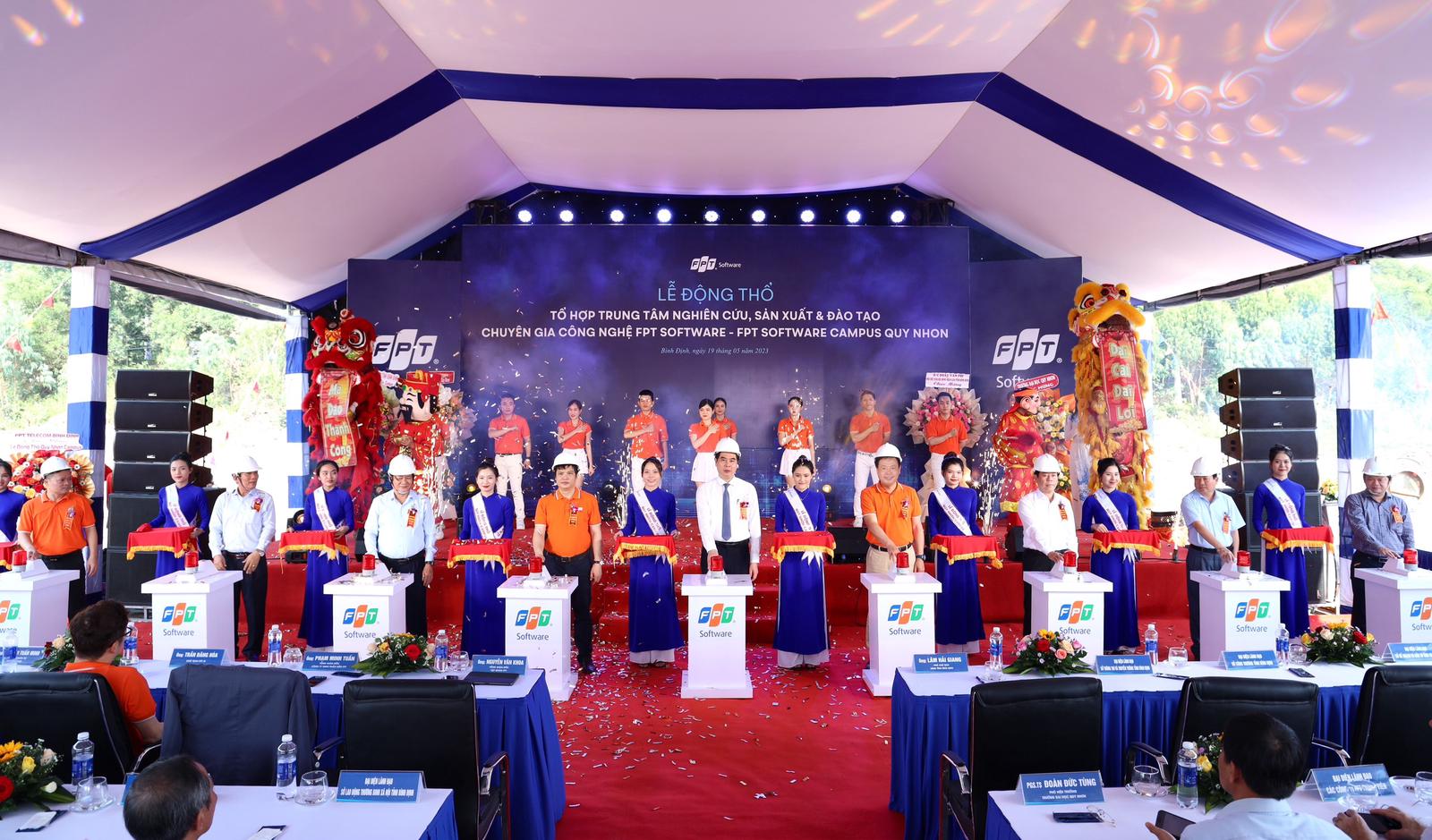 (Thanh tra) - Ngày 19/5, FPT Software (công ty thành viên của Tập đoàn FPT) tổ chức lễ động thổ tổ hợp trung tâm nghiên cứu, sản xuất và đào tạo chuyên gia công nghệ FPT Software tại thung lũng Quy Hòa, khu vực 2, phường Ghềnh Ráng, TP Quy Nhơn, tỉnh Bình Định.