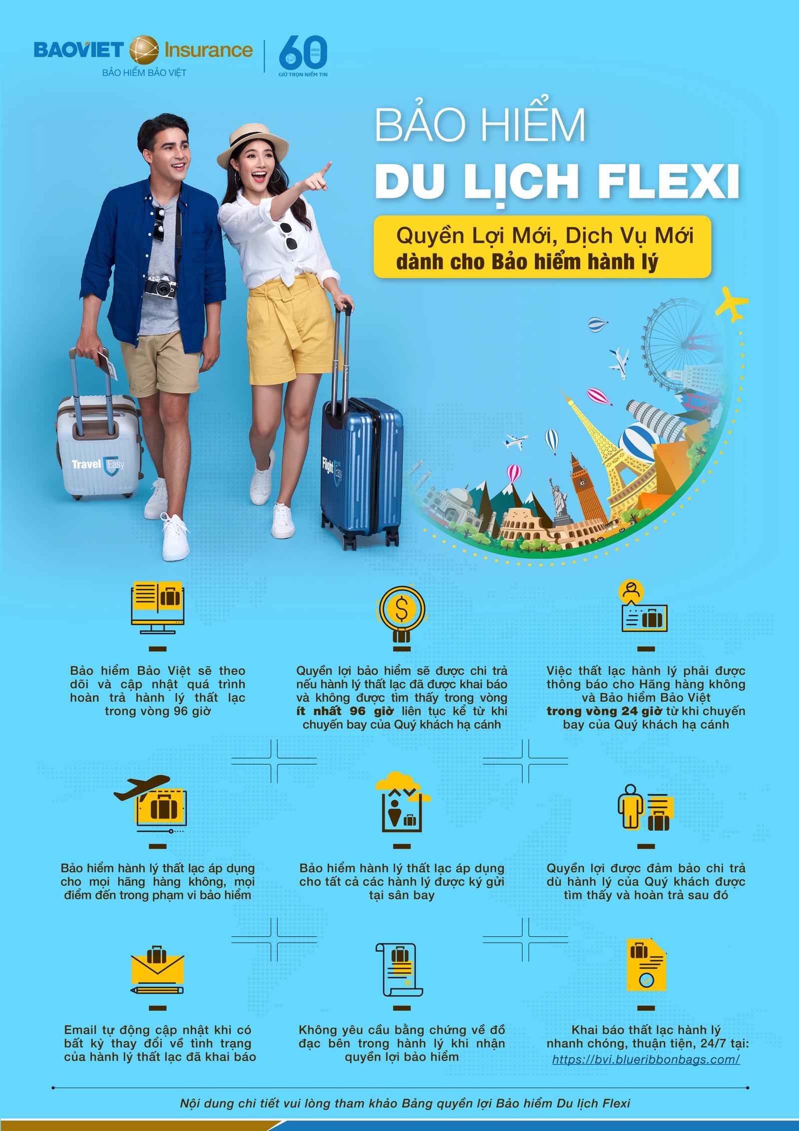Không chỉ là trải nghiệm, du lịch còn giúp vun đắp vốn sống, tình yêu cùng nhiều lợi ích cho sức khỏe. Tuy nhiên, không phải lúc nào chuyến đi cũng hoàn hảo, các rủi ro bất ngờ cả sức khỏe lẫn vật chất là điều khó lường trước, đặc biệt sẽ trở thành gánh nặng khi không may xảy ra ở nước ngoài khó khăn trong giao tiếp cũng như tiếp cận với dịch vụ có chi phí tốt. Quyền lợi mở rộng bảo hiểm thất lạc hành lý của chương trình Bảo hiểm du lịch Flexi là một bước tiến mới của Bảo hiểm Bảo Việt trong việc mang đến cho khách hàng những trải nghiệm du lịch an toàn và trọn vẹn hơn.