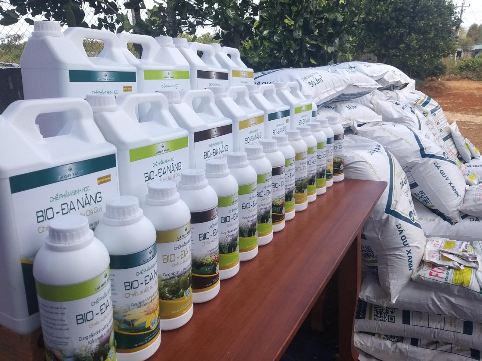 Các sản phẩm đất hữu cơ đa dụng DÃ QUỲ XANH và chế phẩm sinh học Bio-Đa Năng. Ảnh: Trần Thọ