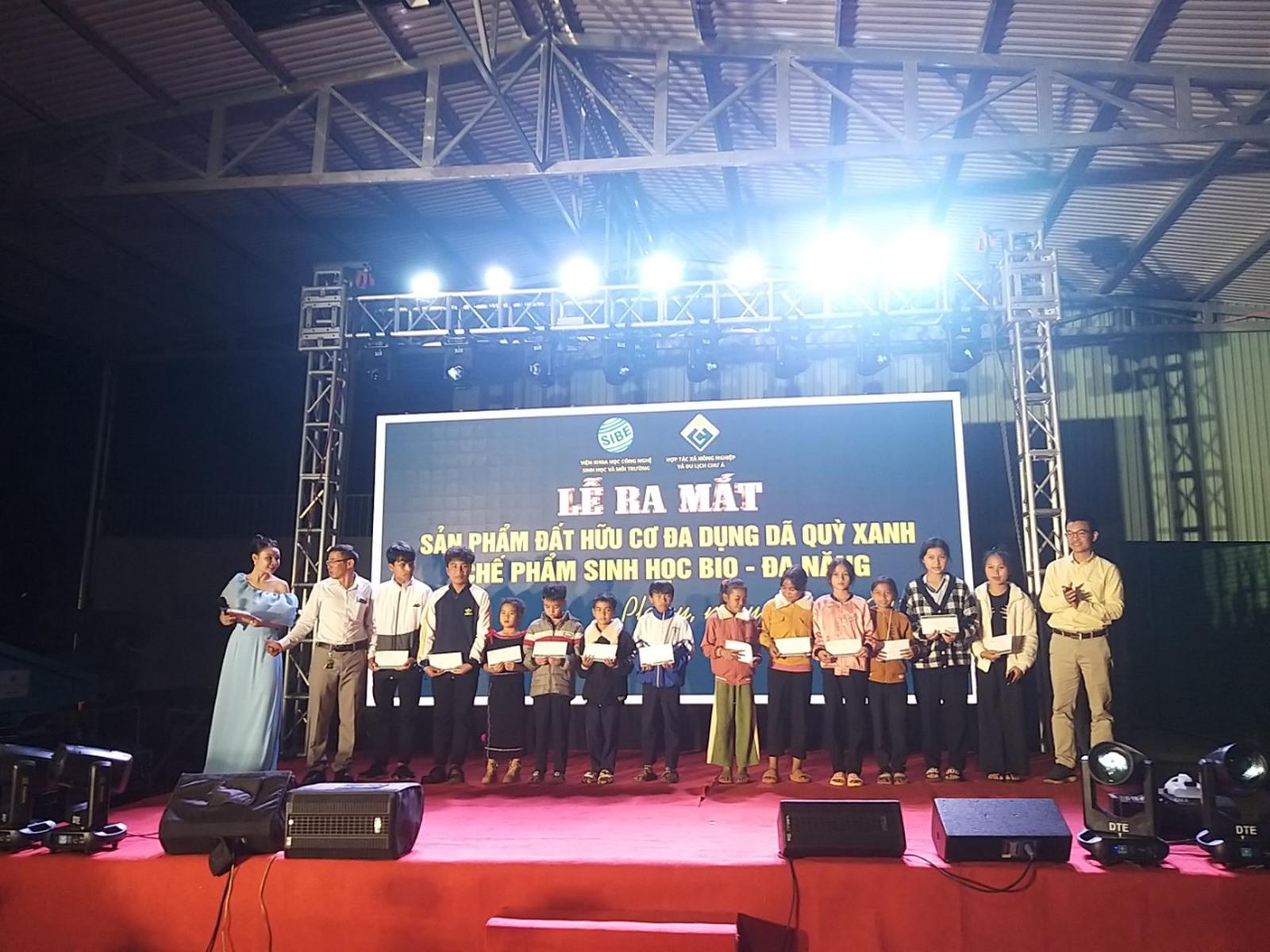 Tại buổi lễ ra mắt sản phẩm đất hữu cơ đa dụng DÃ QUỲ XANH và chế phẩm sinh học Bio - Đa Năng, Hợp tác xã Nông nghiệp và Du lịch Chư Á đã trao 15 phần quà, mỗi phần quà trị giá 300.000 đồng đến các em học sinh là con em đồng bào dân tộc thiểu số tại địa phương.