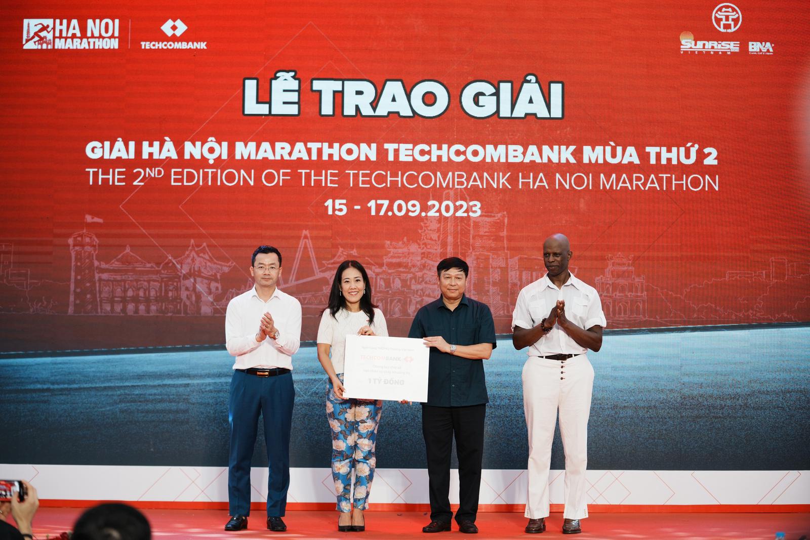 Giải Hà Nội Marathon Techcombank lần này cũng là giải chạy có giá trị giải thưởng tiền mặt cao nhất Việt Nam dành cho cự ly marathon tính đến hiện tại. Hai vận động viên nam và nữ hạng nhất chung cuộc được trao thưởng mỗi người 70 triệu đồng (hơn 3.000 đô la Mỹ). Ngoài hai hạng mục giải thưởng lớn nhất, hai vận động viên Việt Nam có thành tích cao nhất Hoàng Nguyên Thanh và Phạm Thị Hồng Lệ còn đươc trao tặng hai chiếc xe máy điện thời thượng Feliz S từ nhà tài trợ Vinfast.