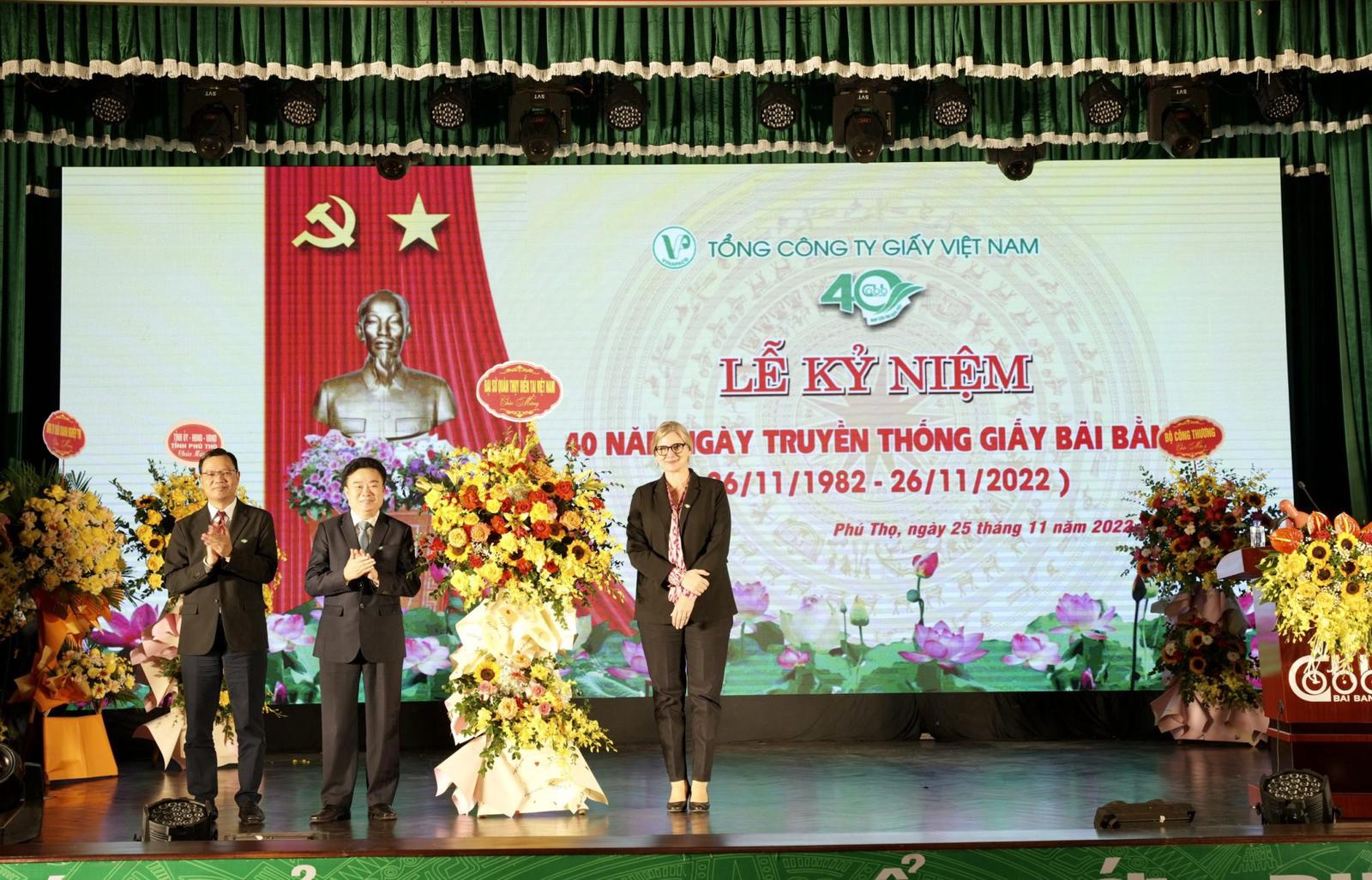 Đại sứ đặc mệnh toàn quyền Vương quốc Thụy Điển tại Việt Nam Ann Mawe tặng hoa chúc mừng tại lễ kỷ niệm 40 năm ngày truyền thống Giấy Bãi Bằng