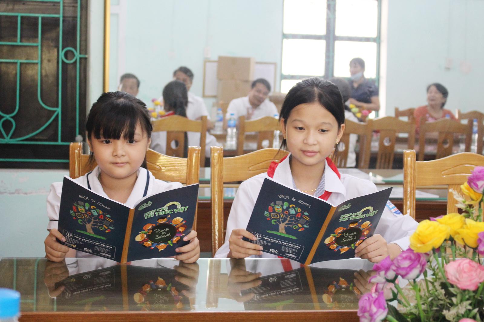 Các em học sinh vui mừng được cầm trên tay sản phẩm Giấy Bãi Bằng – Nhịp cầu tri thức Việt. Ảnh: LP