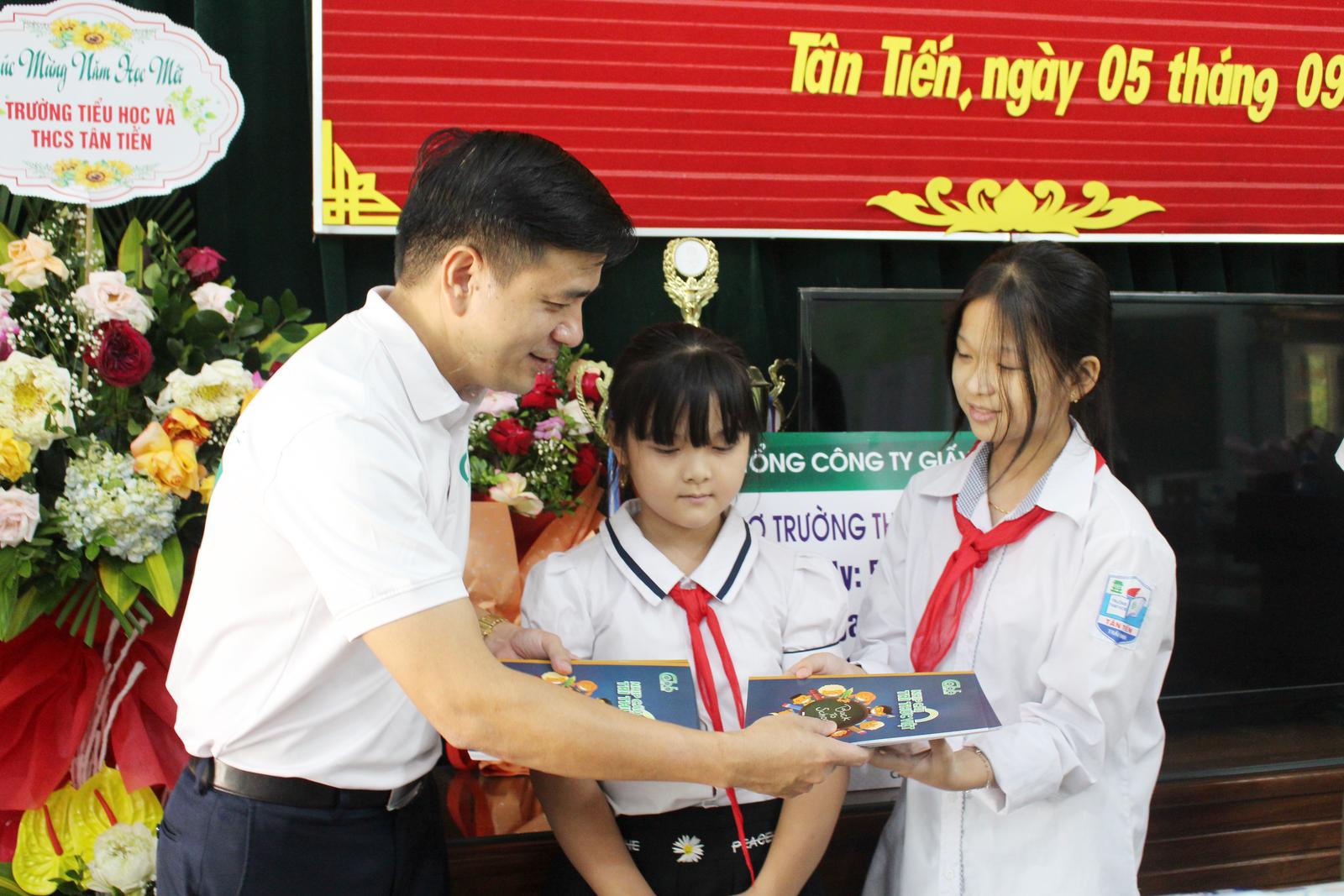 Trưởng Ban Tuyên giáo - Truyền thông VINAPACO Trần Quốc Vượng trao tận tay các em học sinh tại Trường TH và THCS Tân Tiến những quyển vở mang thương hiệu Giấy Bãi Bằng. Ảnh: LP
