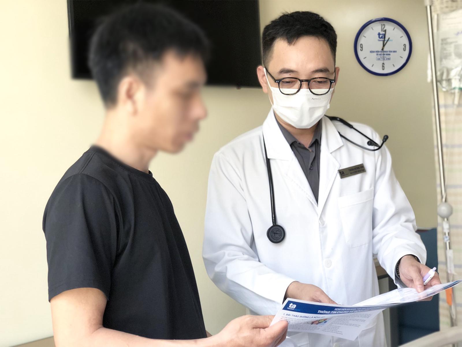 Bác sĩ Hải hướng dẫn con trai ông N. cách chăm sóc, theo dõi sức khỏe người bênh tiểu đường. Ảnh: BVĐK Tâm Anh