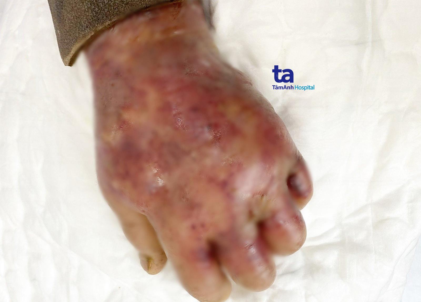 Vùng mu bàn tay và cẳng tay trái sưng đỏ như trái bắp chuối, lở loét, chảy dịch mủ, lốm đốm đen do da hoại tử. Ảnh: BVĐK Tâm Anh