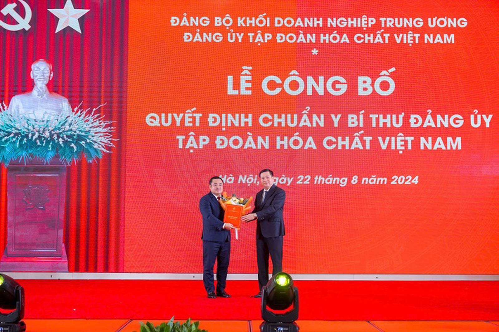 Ông Nguyễn Long Hải - Ủy viên dự khuyết BCH Trung ương Đảng, Bí thư Đảng ủy Khối DNTW trao Quyết định và tặng hoa Bí thư Đảng ủy Tập đoàn Hóa chất Việt Nam Phùng Quang Hiệp