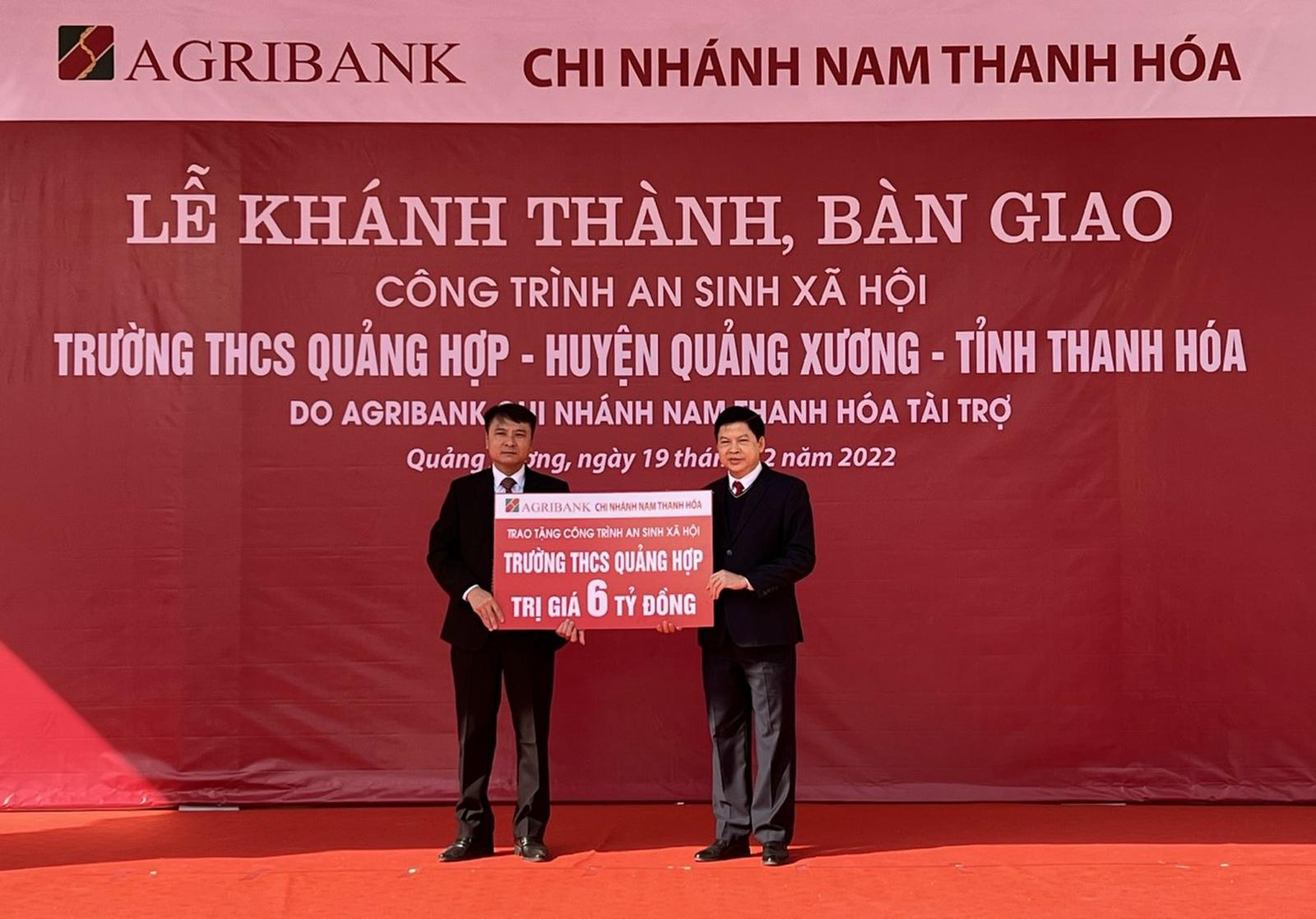 Agribank Chi nhánh Nam Thanh Hóa trao tiền tài trợ công trình an sinh xã hội trên địa bàn huyện Quảng Xương. Ảnh: VT