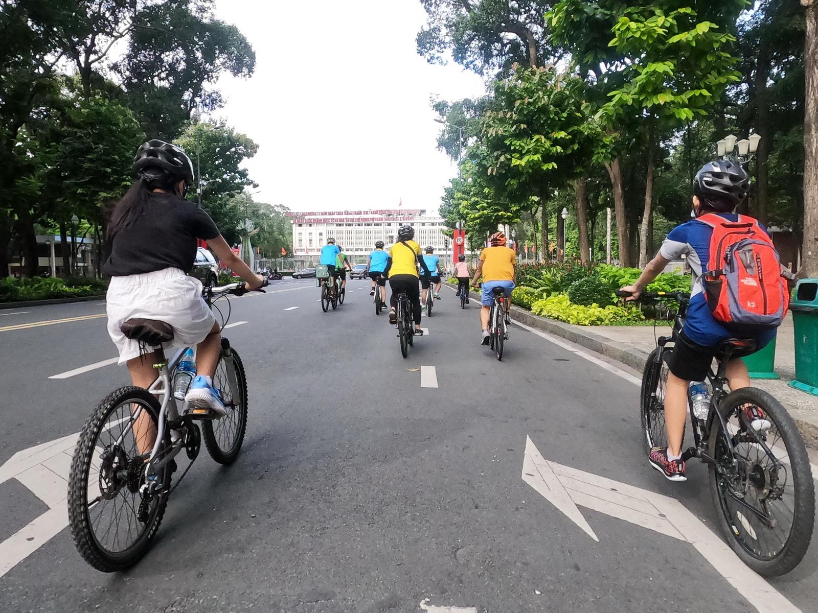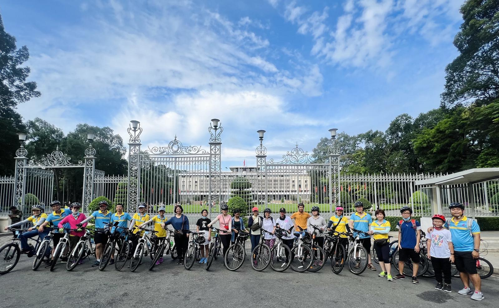 Điểm tiếp theo đoàn dừng lại sau một chặng đường đạp cùng dòng người qua lại trên các con đường đang háo hức chào ngày mới là Dinh Độc Lập. Sau 30 năm kể từ ngày Bác Hồ đọc tuyên ngôn Độc lập, nơi đây là chứng nhân của rất nhiều sự kiện lịch sử, mà dấu son rực rỡ nhất chính là hình ảnh lá cờ Giải phóng tung bay vào ngày 30/4/1975 - đánh dấu thắng lợi hoàn toàn của cuộc kháng chiến chống Mỹ, thống nhất đất nước của quân và dân Việt Nam.