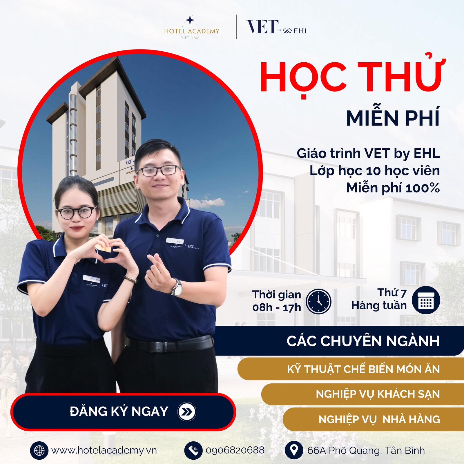 Hiện Hotel Academy Việt Nam đang có chương trình trải nghiệm học thử miễn phí 100% dành cho các sinh viên tương lai. Đây là cơ hội tuyệt vời để trải nghiệm giáo trình và phương pháp giảng dạy đẳng cấp quốc tế và tìm hiểu các chuyên ngành hấp dẫn trong lĩnh vực Nhà hàng, Khách sạn.