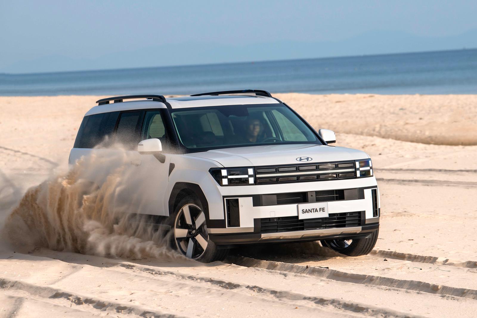 Santa Fe thế hệ hoàn toàn mới cũng trở nên cứng cáp, góc cạnh hơn nhờ phần vòm bánh xe lồi ra, vuông vức. Thân xe thiết kế dạng phẳng tối giản, phù hợp với một chiếc SUV kích thước lớp cũng như giúp tối ưu hoá không gian bên trong. Phần đuôi xe tiếp tục sử dụng công nghệ LED với tạo hình đèn hậu hình chữ H đồng bộ với cụm đèn trước, gia tăng khả năng nhận diện khi di chuyển. Phần đuôi xe có thiết kế phẳng hài hoà trong tổng thể thiết kế khối hộp của xe cũng như gia tăng tiện ích với cốp điện tự động.