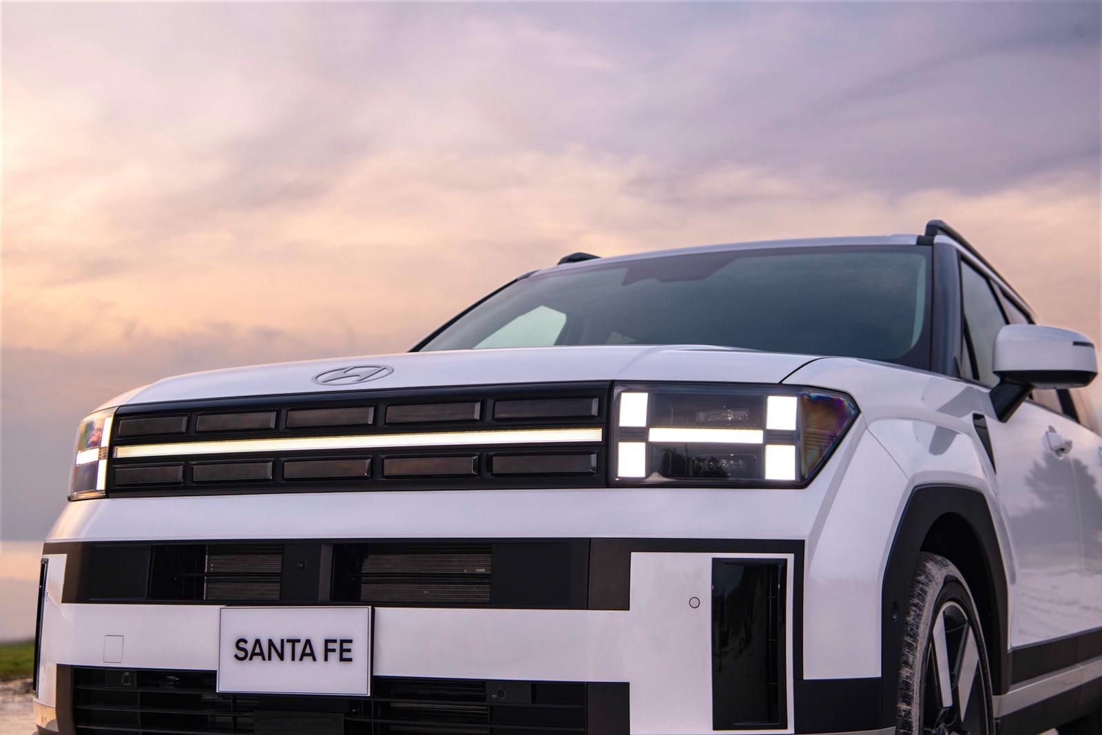 Santa Fe thế hệ mới mang phong cách thiết kế ngoại thất boxy khối hộp đậm chất SUV cổ điển, với cụm đèn chiếu sáng và nắp capo đẩy lên cao, tạo nên tổng thể khoẻ khoắn và thể thao. Điểm nhấn ở phần đầu xe là cụm đèn chiếu sáng Adaptive LED thích ứng tự động (AHB-LED), cùng cụm đèn chiếu sáng ban ngày tạo hình chữ H. Bên cạnh đó, mặt ca-lăng lấy cảm hứng từ logo Hyundai dạng phẳng 2D, làm nên tổng thể thiết kế táo bạo cá tính. Mặt ca-lăng của xe được trang bị tính năng AAF (Active Air Flap) mở/ đóng tự động thông minh tùy theo các chế độ vận hành nhằm tối ưu hệ số cản gió nhưng vẫn đảm bảo làm mát động cơ và hệ thống phanh. Cụ thể chỉ số cản gió thế hệ thứ 5 này là 0,298Cd (ngang với một chiếc sedan) còn thế hệ trước đó là 0,33Cd.