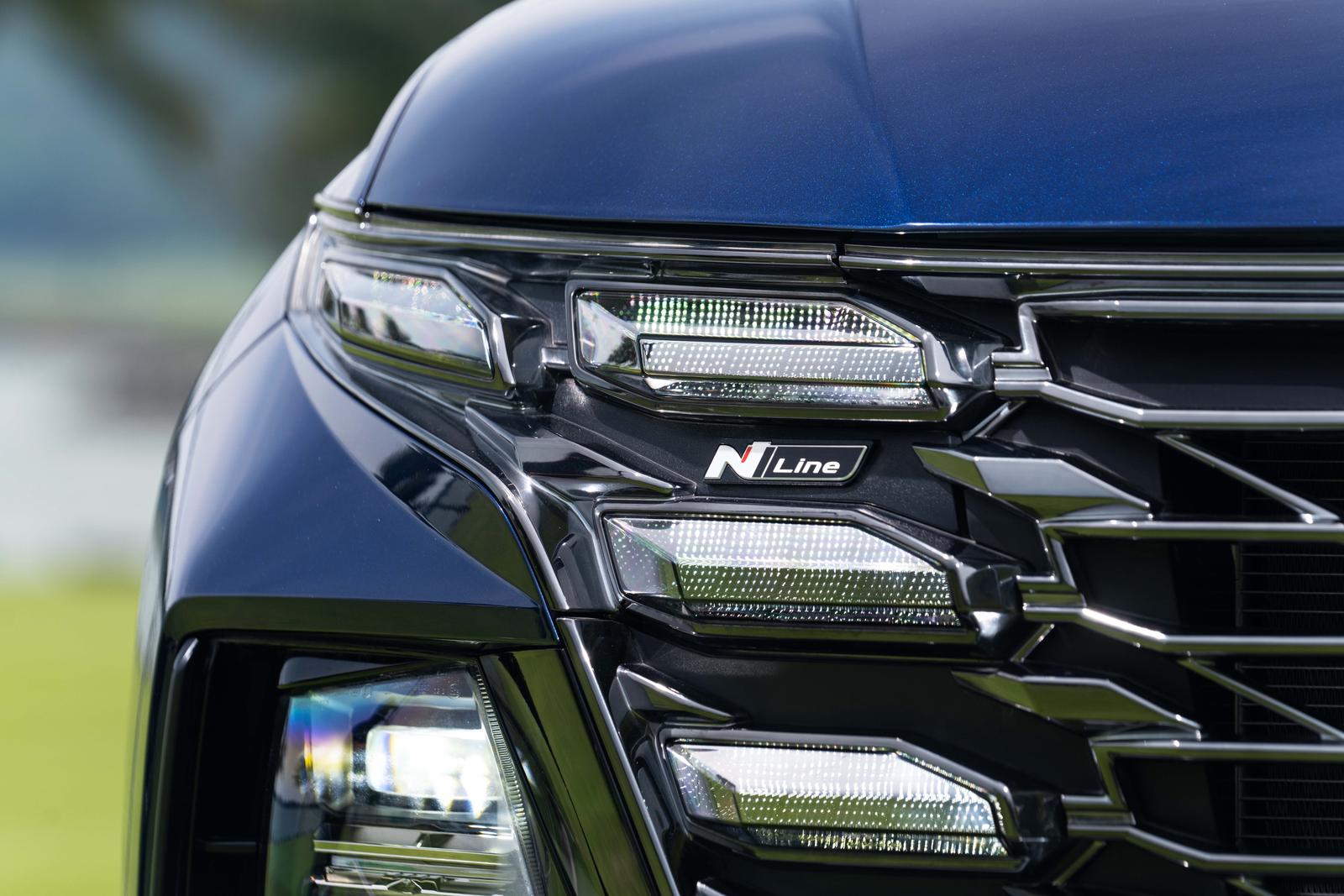 So với Tucson phiên bản tiêu chuẩn, Tucson N Line sở hữu những chi tiết nổi bật vừa đủ để phân biệt tạo nên sự cá tính thể thao mà không quá khác biệt. Điểm nhấn lớn nhất về ngoại thất là lưới tản nhiệt phong cách Parametric Jewel Hidden Lights cùng cản trước được thiết kế riêng theo phong cách thể thao, mạnh mẽ hơn bản tiêu chuẩn. Logo N Line được xuất hiện tinh tế giữa dải LED DRL trên mặt cản trước một góp phần làm nên dấu ấn đặc trưng cho Tucson phiên bản phong cách thể thao này. Hông xe cũng được trang bị logo N Line ở phía dưới gương chiếu hậu.