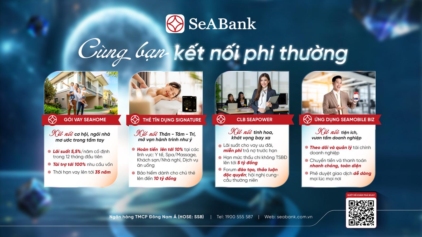 Trải qua ba thập kỷ phát triển, SeABank luôn lấy khách hàng làm trọng tâm và không ngừng nỗ lực đa dạng hóa sản phẩm dịch vụ, nâng cao trải nghiệm, kết nối khách hàng đến những giá trị cao nhất trong cuộc sống, chạm tới những khát vọng và tỏa sáng. Hành trình vươn tới ước mơ dù có thể nhiều chông gai thử thách nhưng hãy cứ dũng cảm bước tiếp vì luôn có SeABank cùng khách hàng kết nối phi thường, chắp cánh cho ước mơ của bạn.