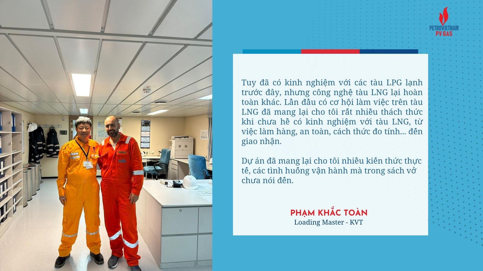 Trước khi tiếp nhận tàu LNG, anh Toàn đã có kinh nghiệm làm Loading Master cho tàu LPG lạnh từ năm 2013. Tuy nhiên, LNG lại là một lĩnh vực hoàn toàn mới, bên cạnh việc tham gia các khóa đào tạo về LNG, Loading Master for LNG, công ty cũng đã mua các tài liệu của nước ngoài để anh Toàn tìm hiểu, học hỏi và tham khảo thêm.